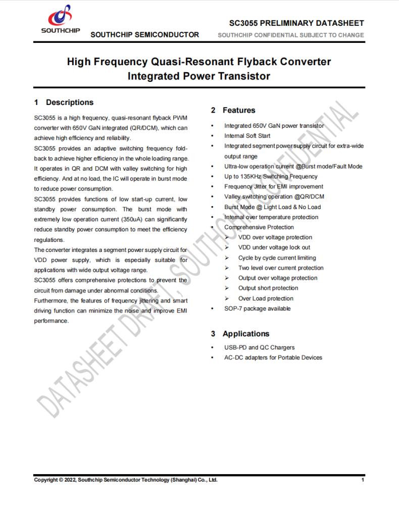 SC3055是南芯高性能SSR高频QR控制器与GaN功率器件的完美结合,更加利于发挥GaN器件低阻抗、低开关损耗的优良性能;QR工作模式,可支持135kHz开关频率;提高系统的功率密度,满足日趋小型化的需求;特有的降频策略,使得全功率范围获得理想的转换效率。采用SOP-7封装,体积小巧,方便工程师制作样机。这颗芯片可开发成25W以下小功率USBPD、QC快充充电器,也可以开发成AC-DC适配器。