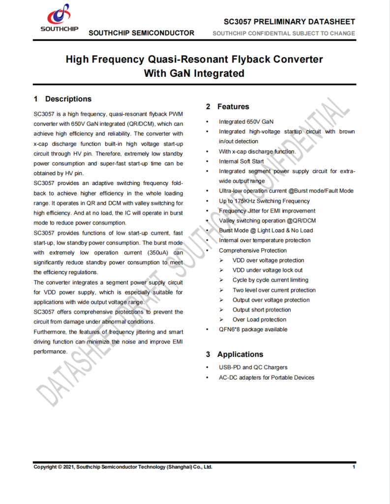 南芯SC3056是一颗高频准谐振反激转换器,具有高能效和高可靠性,源自南芯半导体的SC305x系列。SC3056内部集成650V耐压的氮化镓开关管,可轻松驱驾30W~40W输出功率范围。