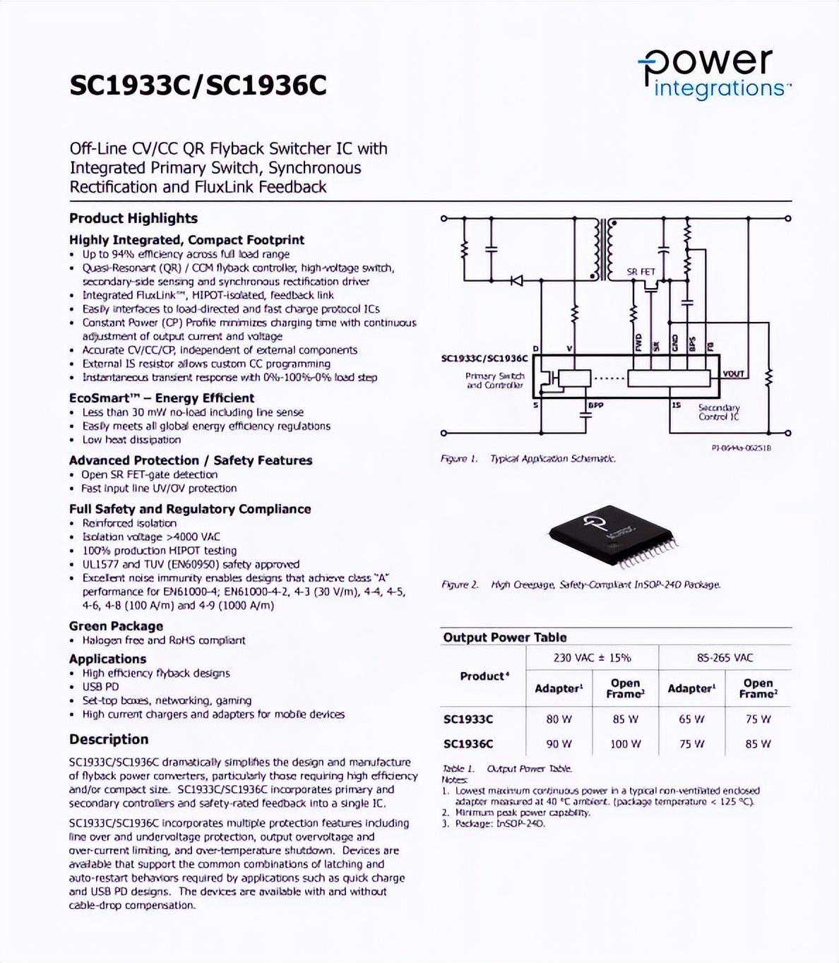 SC1933C芯片内置GaN功率器件,支持宽电压输入范围下65W输出。采用InSOP-24D封装,集成高压启动和X电容放电功能,广泛应用于快充充电器,可应用到USB-PD快充设备和快充需求的手机充电器。