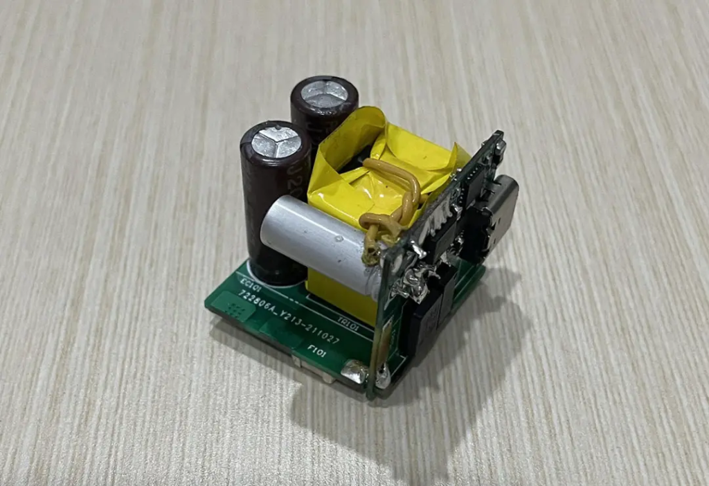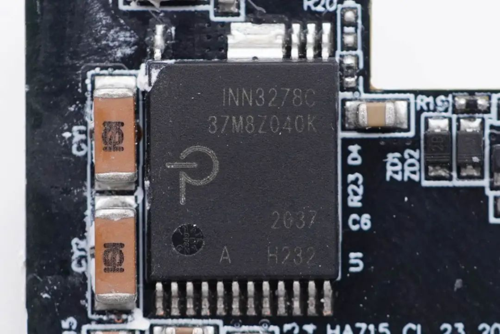 主控芯片INN4075C采用InSOP-24D封装。集成高压启动功能,支持最大105W输出。这是新一代InnoSwitch4系列芯片,应用于有源钳位反激架构,可实现主开关管的零电压开关,降低器件温升。同时优化EMI性能,非常适合小体积,高工作频率的开关电源设计。
