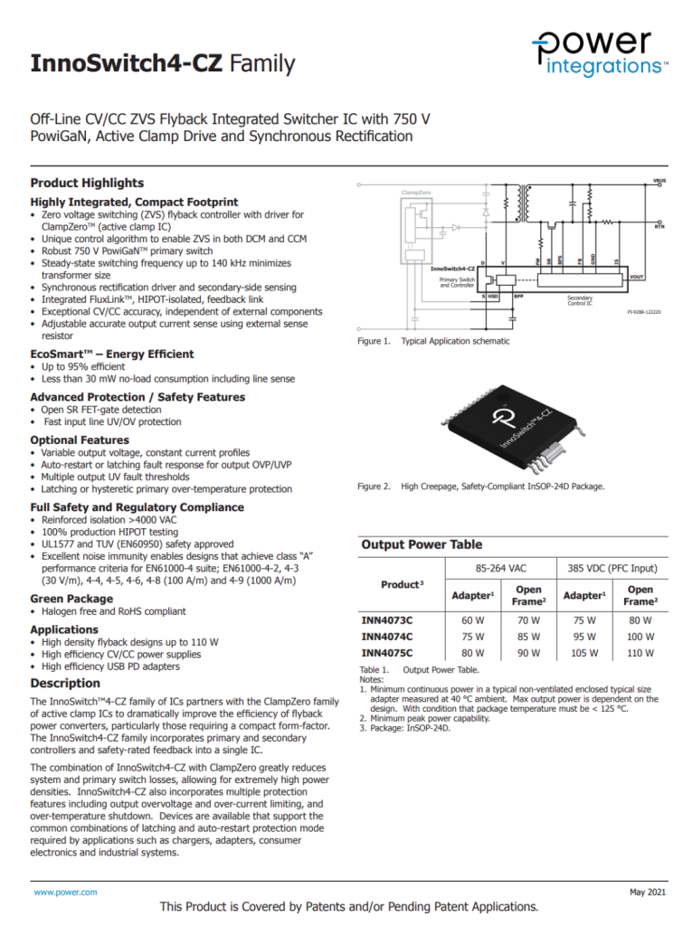 InnoSwitch4-CZ系列器件集成了多项保护特性,包括输入过压及欠压保护、输出过压及过流限制以及过温关断。所提供的器件均支持领存与自动重启动的常用组合,这是快充和USBPD设计等应用所要求的特性。所提供的器件提供输出线压降补偿选项。
