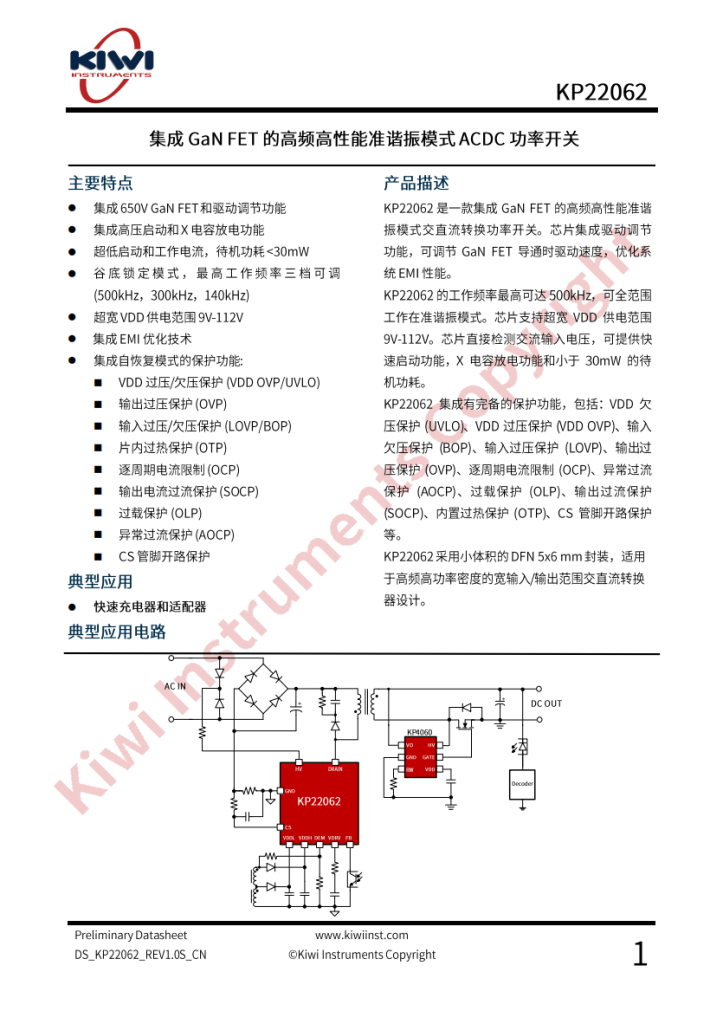KP22062的工作频率最高可达500kHz,可全范围工作在准谐振模式。芯片支持超宽VDD供电范围9-112V。芯片直接检测交流输入电压,可提供快速启动功能,X电容放电功能和小于30mW的待机功耗。