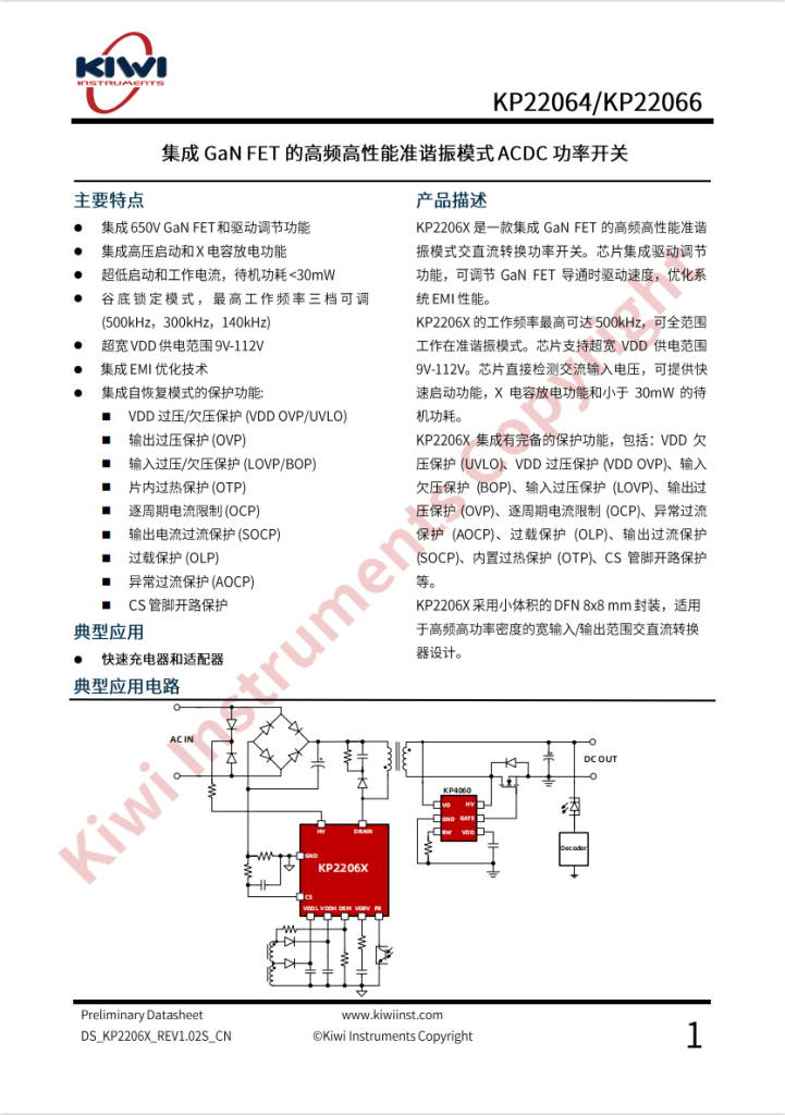 KP22064/KP22066的工作频率最高可达500kHz,可全范围工作在准谐振模式。芯片支持超宽VDD供电范围9-112V。芯片直接检测交流输入电压,可提供快速启动功能,X电容放电功能和小于30mW的待机功耗。