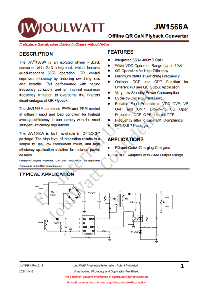 杰华特JW1566A内置650V耐压,480mΩ氮化镓开关管,芯片支持最高90V供电电压,最高开关频率可达260kHz,内置高压启动电路,具有超低的待机功耗。杰华特JW1566A集成了多项保护特性,包括输入过压及欠压保护、输出过压及过流限制以及过温关断。所提供的器件均支持领存与自动重启动的常用组合,这是快充和USBPD设计等应用所要求的特性。所提供的器件提供输出线压降补偿选项。
