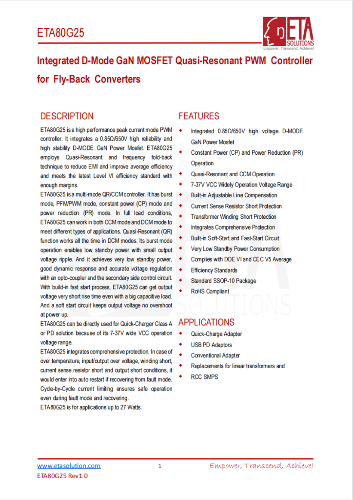 ETA80G25支持90-264V输入,支持27W功率输出。芯片支持CCM/QR/DCM运行模式,满载最高开关频率80kHz,轻载下支持频率折返控制,可实现全功率范围内的高效率。ETA80G25集成了多项保护特性,包括输入过压及欠压保护、输出过压及过流限制以及过温关断。所提供的器件均支持锁存与自动重启动的常用组合,这是快充和USBPD设计等应用所要求的特性。所提供的器件提供输出线压降补偿选项。