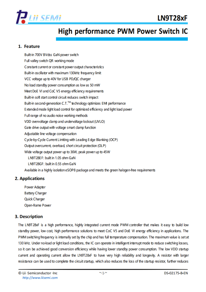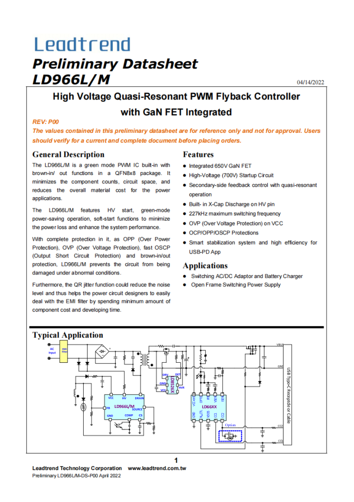 LD966L/M是为驱动GaNFET设计的高频高性能PWM控制器。芯片集成高精度GaNFET驱动,可调节GaNFET导通时驱动速度,优化系统EMI性能,芯片内部集成650V氮化镓开关管。LD966L/M采用小体积的QFN8*8封装,适用于高频高功率密度的宽输入/输出范围交直流转换器设计。可以广泛应用于AC/DC适配器和储能电池。