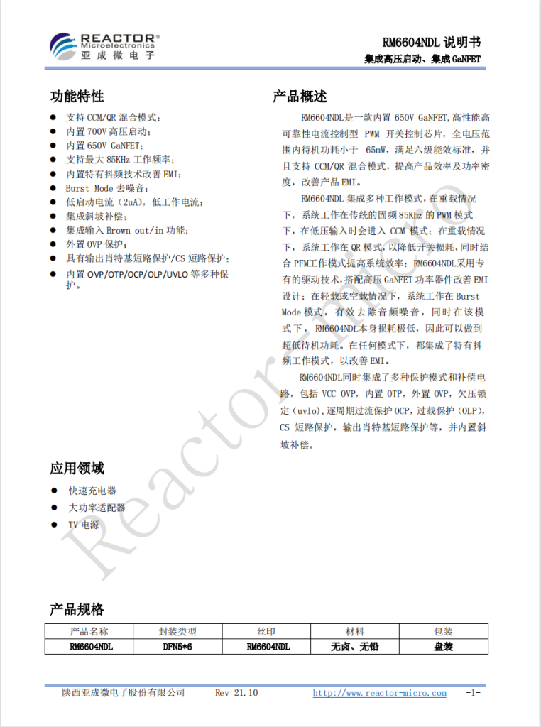 RM6604ND亚成微RM6604ND/NDL是一款集成了650VGaNFET、氮化镓驱动器、驱动保护以及高压启动的氮化镓功率集成电源芯片,CCM/QR反激运行模式,支持最大36W快充,全电压范围内待机功耗小于65mW,满足六级能效标准,具有小体积、高效率、高性能、低功耗等特点,满足快充电源小型化设计要求。此外,芯片采用DFN5*6封装,成本更为优异。