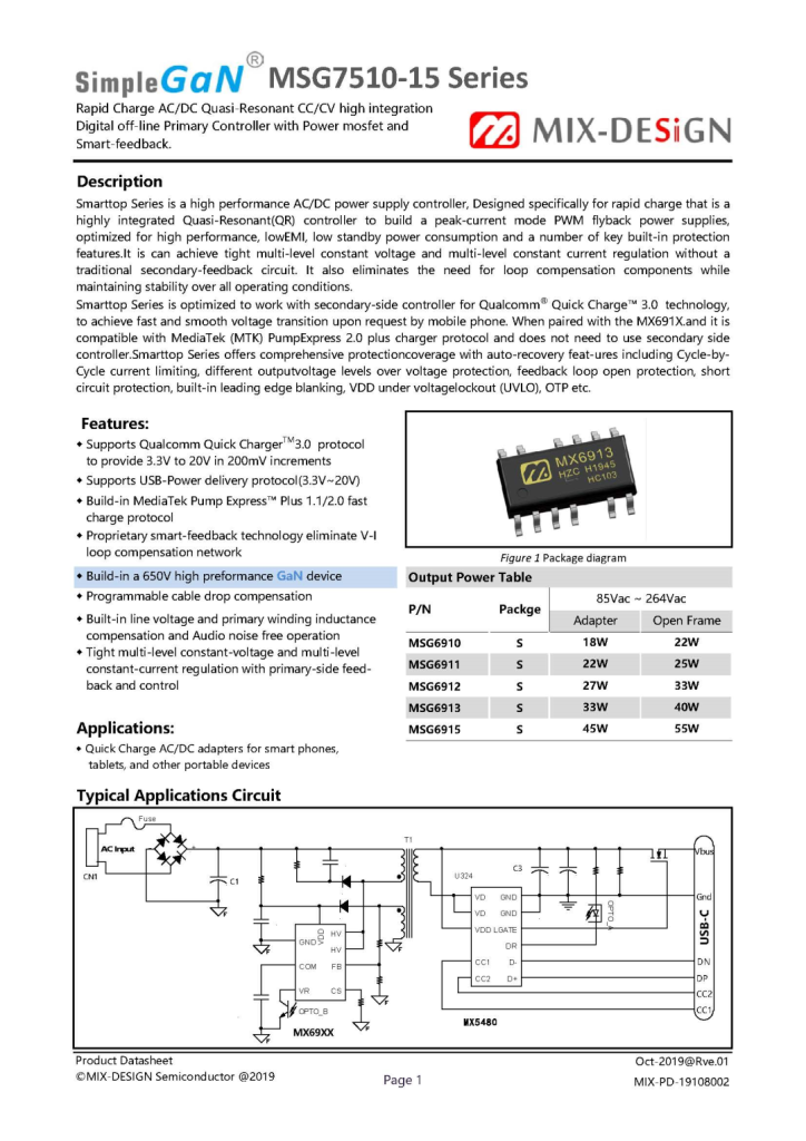 MSG7511x集成了多项保护特性,包括输入过压及欠压保护、输出过压及过流限制以及过温关断。适用于快充电源适配器,可用于手机,笔记本电脑等便携设备。