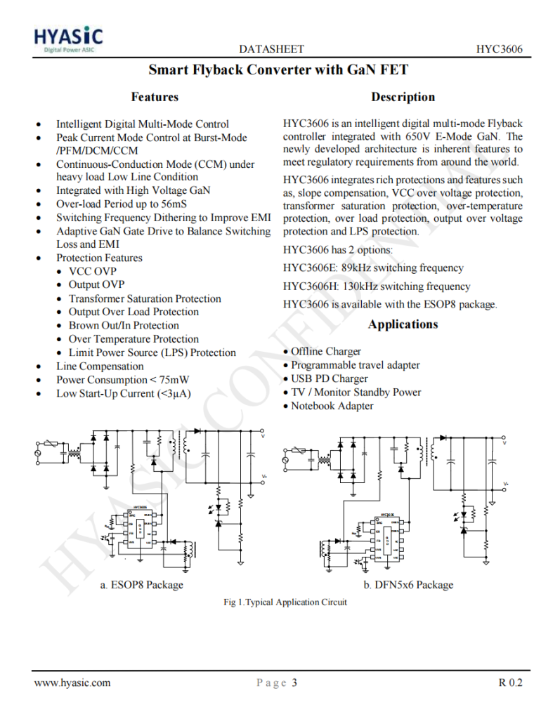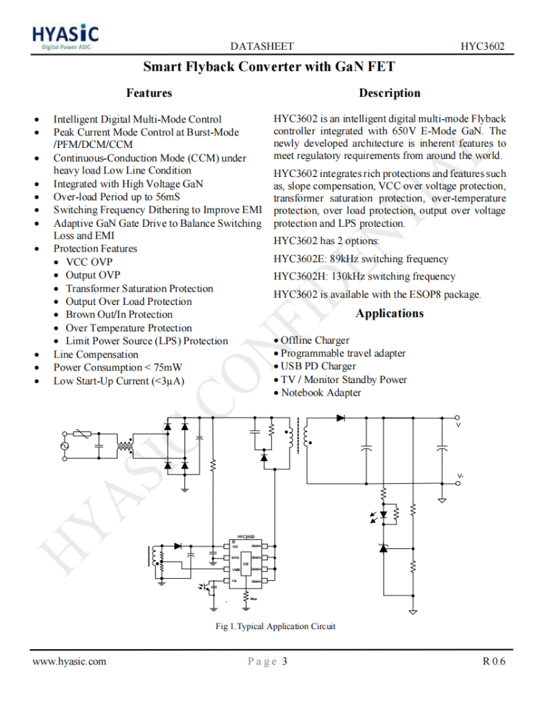华源半导体HYC3606E/H内置智能多模式数字控制,支持支持CCM/DCM/PFM/突发运行模式,以获得效率和性能的平衡。芯片采用ESOP8封装,体积小巧。芯片内部集成高压氮化镓开关管,数字多模式反激控制器,通过合封的方式消除寄生参数对高频开关造成的干扰,并减小外部元件数量,为氮化镓快充提供精简高效的电源方案。