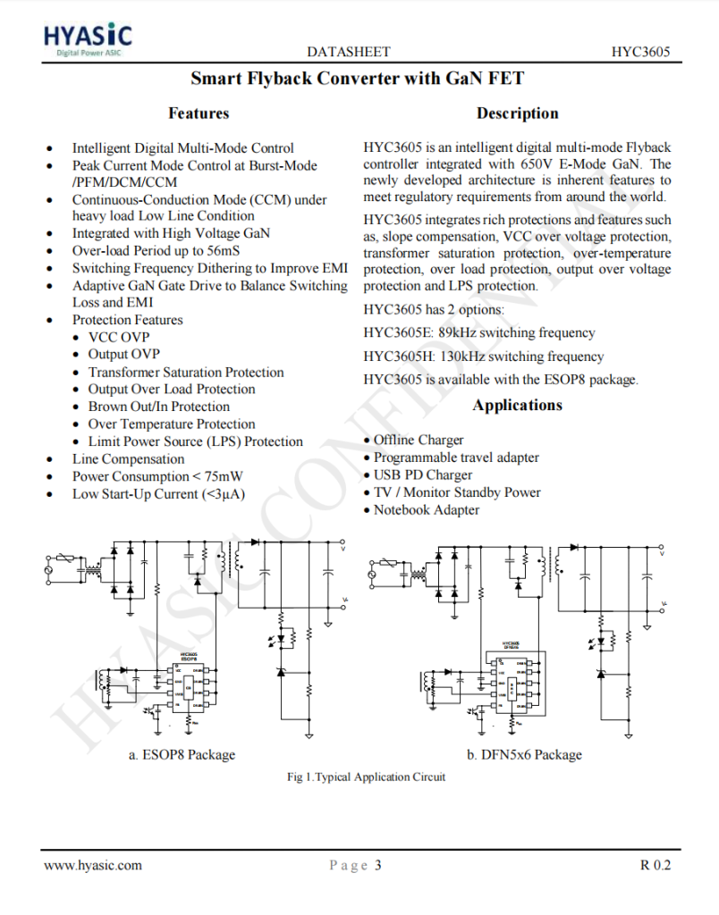 华源半导体HYC3605E/H内置智能多模式数字控制,支持支持CCM/DCM/PFM突发运行模式,以获得效率和性能的平衡。芯片采用ESOP8封装,体积小巧。芯片内部集成高压氮化镓开关管,数字多模式反激控制器,通过合封的方式消除寄生参数对高频开关造成的干扰,并减小外部元件数量,为氮化镓快充提供精简高效的电源方案。