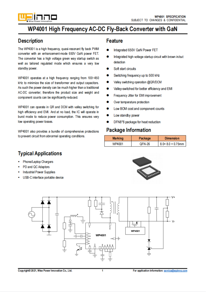 WP4001采用了QFN-26封装模式,内置高压启动和X电容放电,可以应用到最大功率65W的充电器,支持650V的高压启动,最大工作频率为500KHz,降低变压器和输出滤波电容的体积。可以广泛应用于QC快充和PD快充,也可应用于手机和电脑的电源适配器。