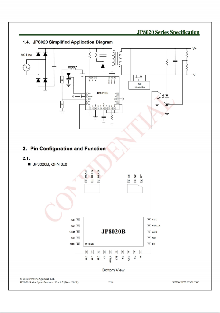JP8020B165、JP8020B365系列为AC/DC转换应用提供了高度集成的解决方案,集成启动开关,可以有效控制成本和数量,待机功耗极低。芯片都采用了QFN8*8封装方式,具备高压启动,支持最大输出功率分别为40W和65W。广泛应用于快充充电器,也可运用于手机和笔记本电商的电源适配器上。