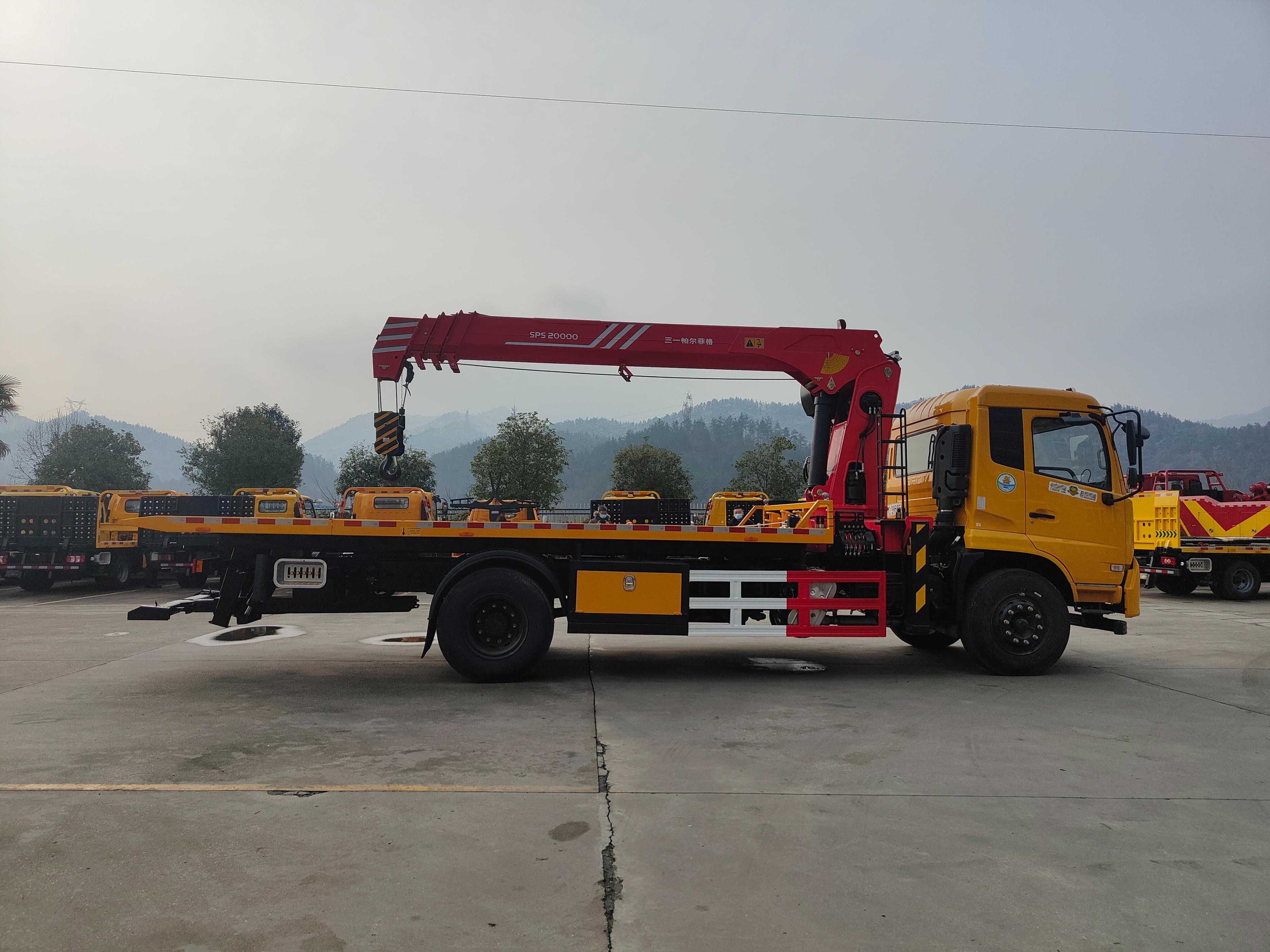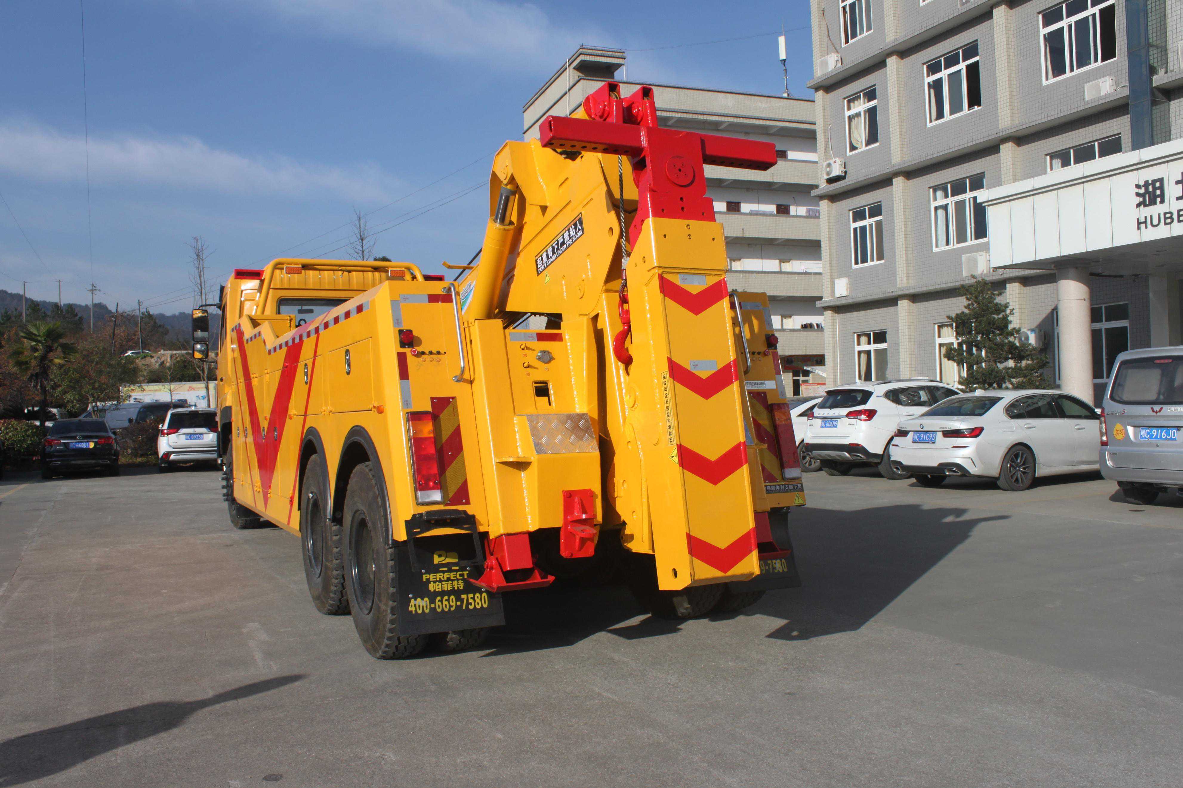 帕菲特20T20D拖吊联体上装:20吨3节拖臂,拖臂升缩油缸90,拖臂折叠油缸140,标准拖臂最大有效长度2850mm;20吨2节吊臂,吊臂伸缩油缸100,双变幅油缸140;两个10吨绞盘,30米钢丝绳;标配遥控器;倒车影像。