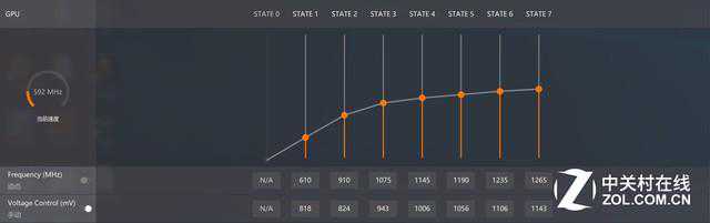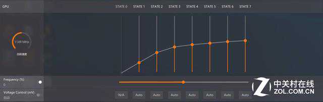 那么这个“精确超频”又何从谈起呢?打开WattMan,在界面中部我们可以看到一个拥有7个节点的折线图,每个节点代表一个阶段,整个折线图就代表了频率的变化曲线。我们可以根据自己喜好,自由设定不同阶段频率所能达到的数值以及相应的GPU电压,这也就是说我们在超频时可以做到频率及电压的阶段性微调,不再像以前那样只是将频率拉杆拉高,设定频率的最大值。