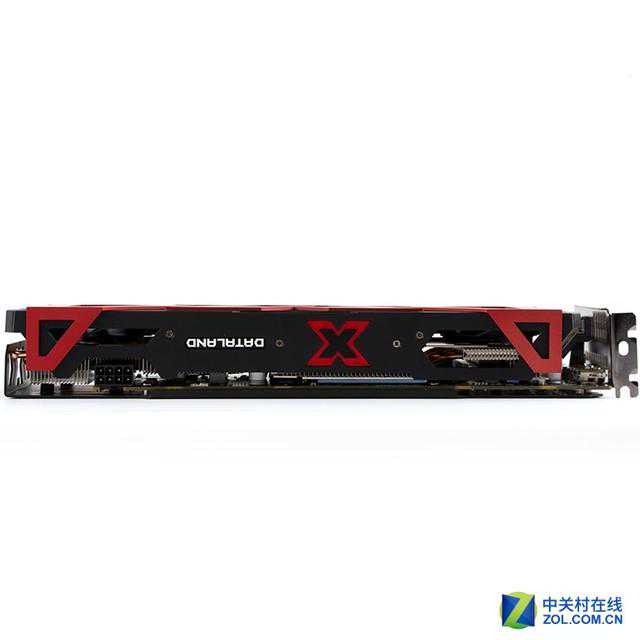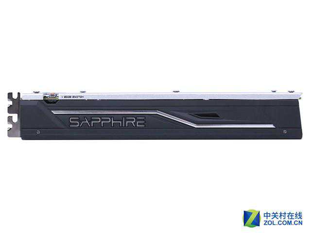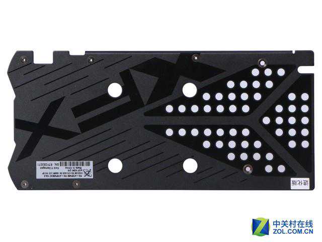 讯景RX470黑狼进化版的背板经过XFX重新设计,背板上印有XFX的LOGO,而且开孔上也有3个不规则图形拼凑出的箭头形图案,在保护PCB的同时也让显卡更显帅气。
