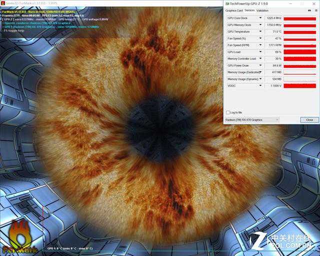 温度方面我们将继续采用FurMark来进行测试,考虑到不同游戏之中,显卡的负载率不同,尤其是低分辨率和高分辨率的负载率差异会让显卡的功耗完全无法测算平均数值。因此我们需要采用Furmark这样的权威性烤机软件,让GPU芯片之中每一个运算单元完全满载,充分发挥供电最大化的状态才能得出准确的成绩。由于FurMark对RX470的支持不完善,因此不能显示RX470实际的温度,我们用最新版本的GPU-Z来查看烤机一段时间后RX470的温度。另外需要注意的是,成绩显示的是讯景RX470黑狼进化版的温度,并不代表公版温度。