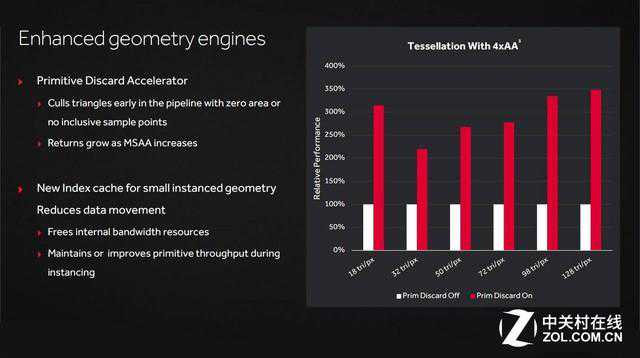全新架构的几何引擎性能得到了一定程度的提升,其内置的PrimitiveDiscardAccelerator将在初始建模之前,会筛选出根据3D图像的距离逻辑,省略掉较远处物体建模的曲面细分指令。由于距离远,对远处物体的建模是无用的,虽然视觉上看不到,但还是会一样消耗性能,因此AMD选择放弃这一部分,不进行曲面细分,从而提升几何引擎的效率。而新建索引缓存则可为更小的几何实例服务,以便减少数据移动,释放内部带宽资源,并提高原始吞吐量。