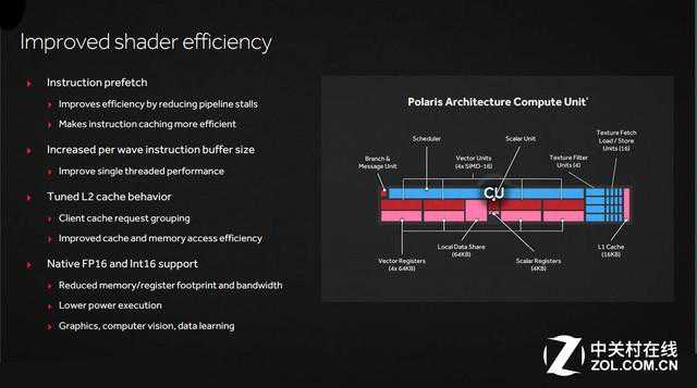 2、与“Fiji”相同的宏观并行结构,36组CU单元被分为4个ShaderEngines,每个ShaderEngines包含9组CUs。每个CU的Shader效率照比前代提升了15%,同时几何引擎也有所改进。