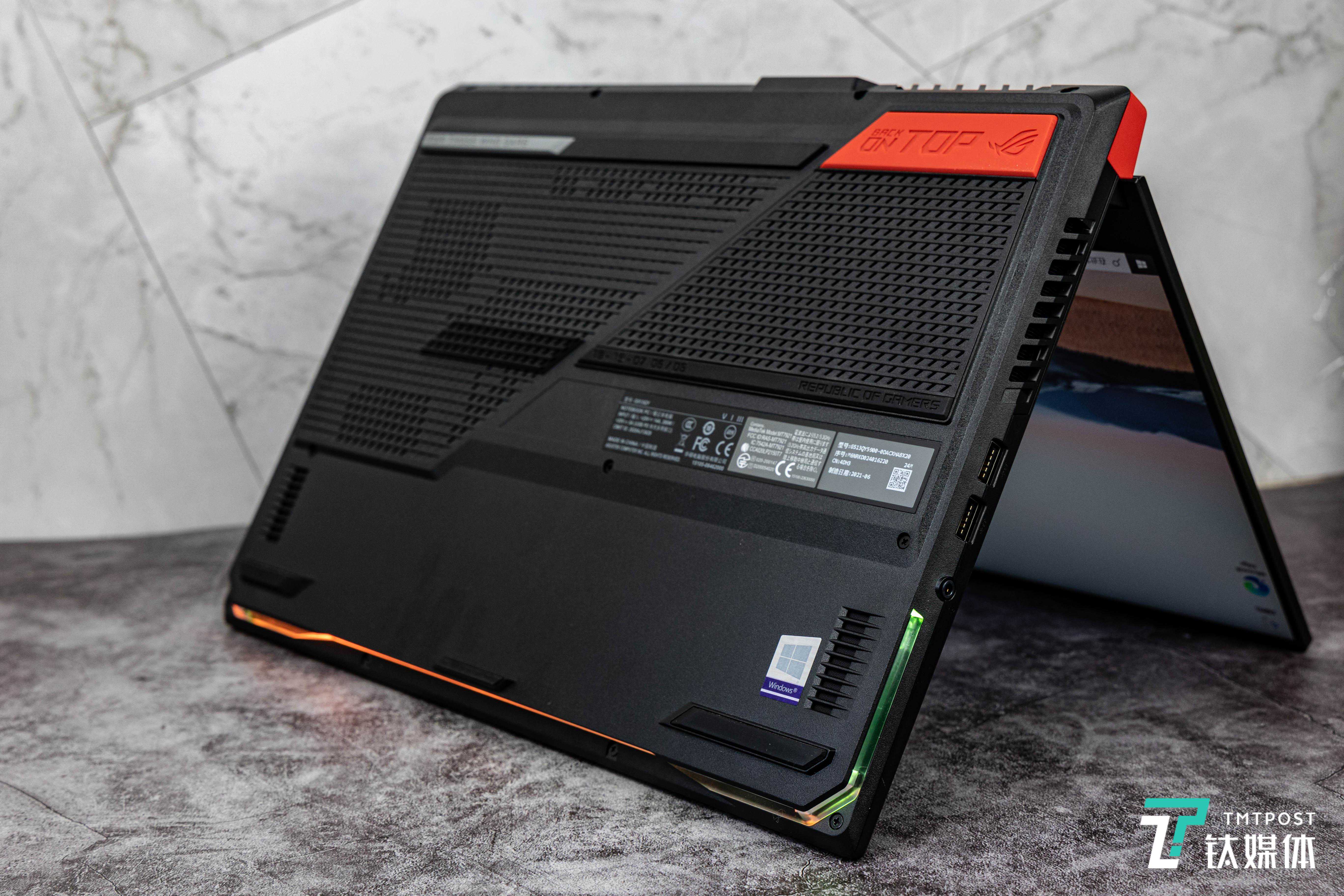 魔霸5R的A面设计就有些不一样了:它的屏幕部分与底座是分离的,并且还贴心地为状态指示灯留出了一小块缺角。在底座部分,它采用了撞色网格设计,边缘处的一抹红色足够彰显个性。