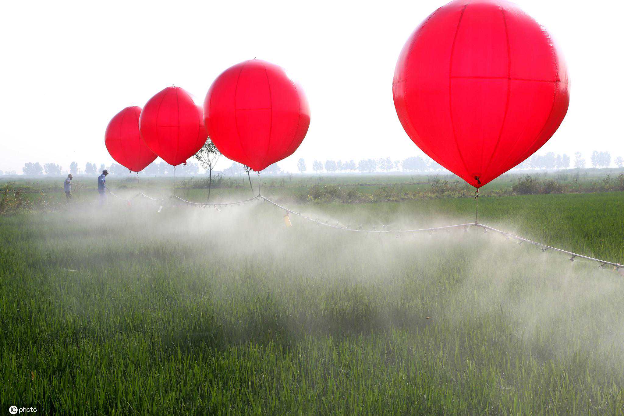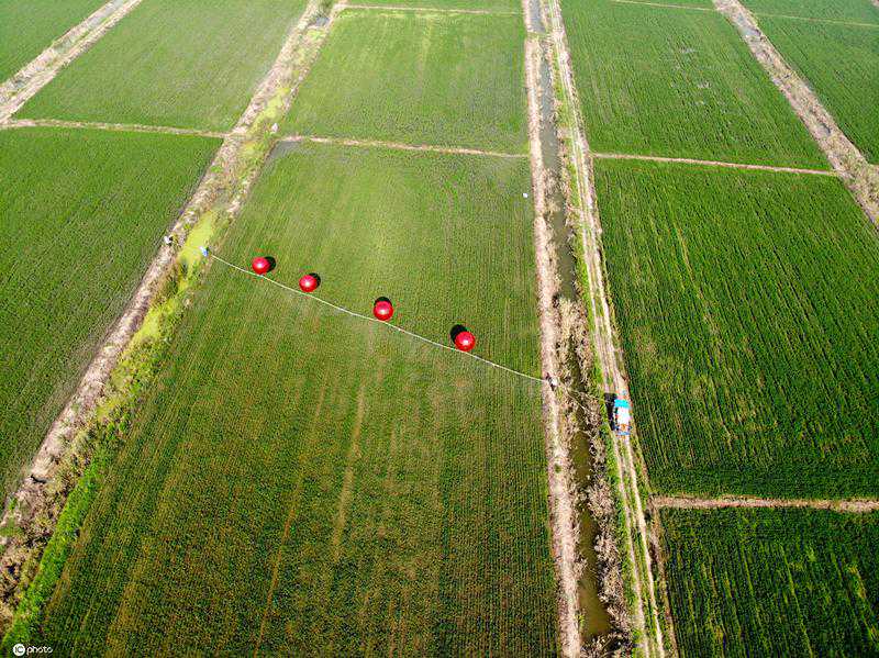 连日来,江苏省连云港市青口大新农场采用氦气球喷药,防虫护管只需3-4个工人,喷药跨度可根据地形调整,一个小时可喷洒80余亩,一天就可以完成800亩稻田喷药,大大提高了工作效率。氦气球喷药技术是通过氦气球自身浮力将喷管吊起到田地之上,通过调整氦气球数量和间距,可调整喷管离地距离,同时可调整喷嘴喷洒范围。