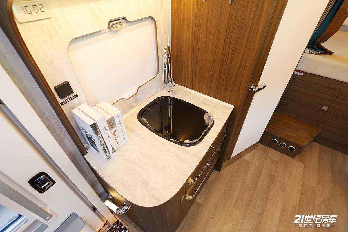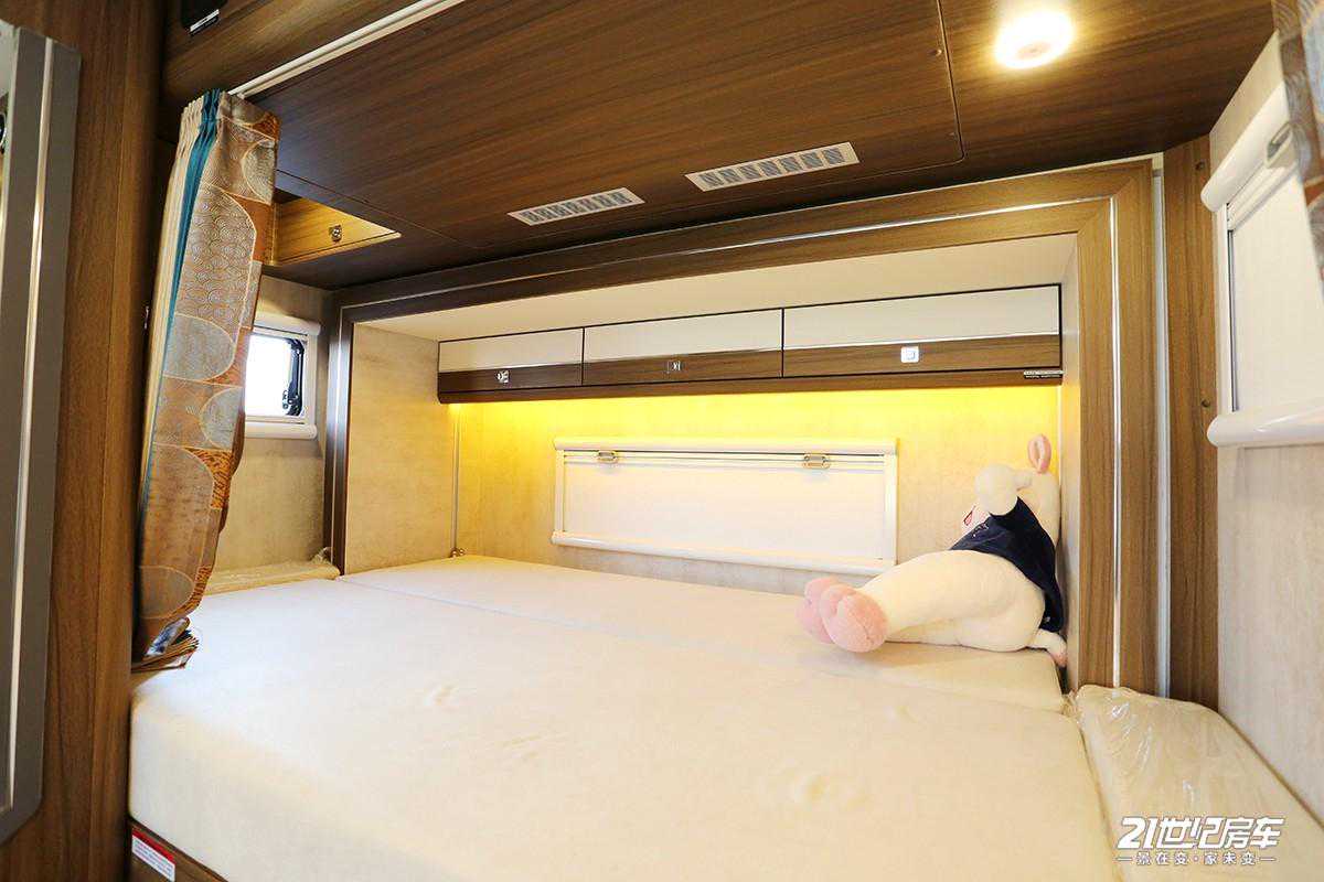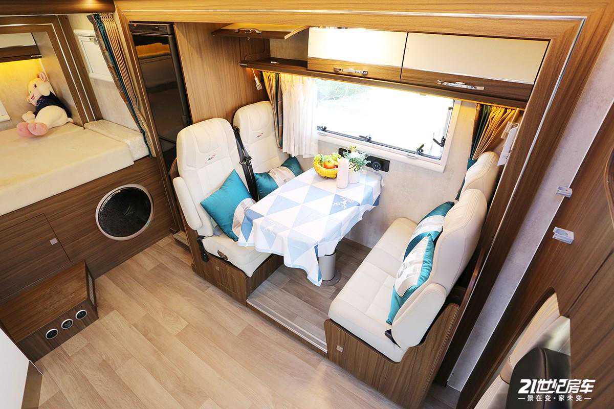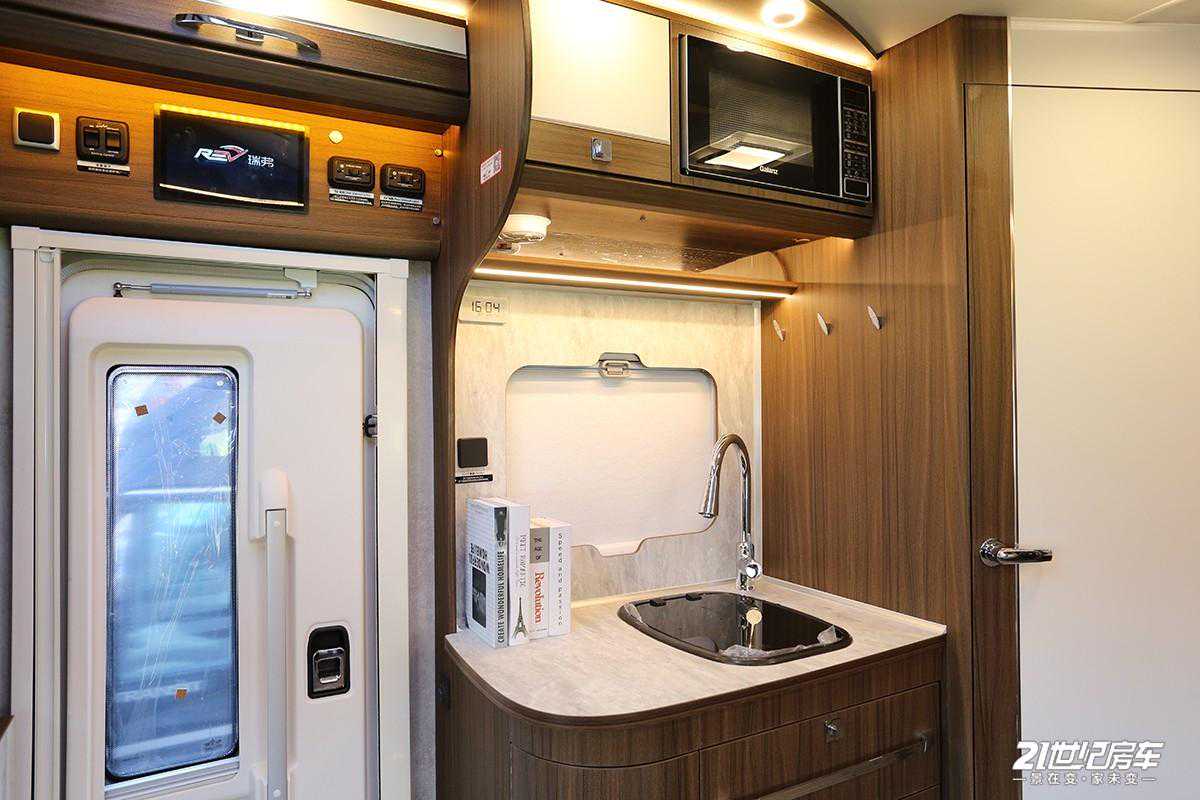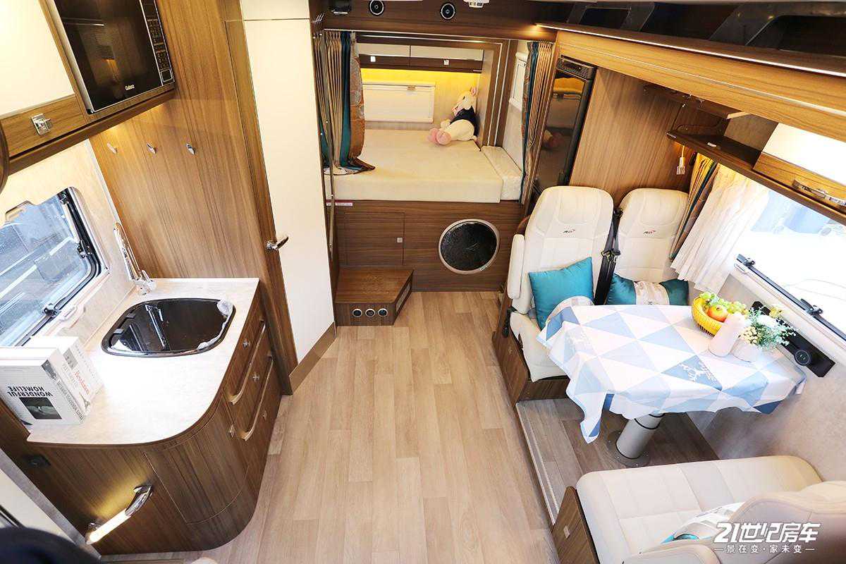 6.5T瑞弗V820的内饰和4.5T车型内饰基本上类似,还是以深色板材饰面为主,搭配暖黄色氛围灯。新车继续保留后行车空调出风口的设计,前方是双人额头床、中部是会客区和厨房区,车尾是一张可拓展的双人床位。新车相比旧款4.5T车型做了升级优化,更适合新手用户使用。