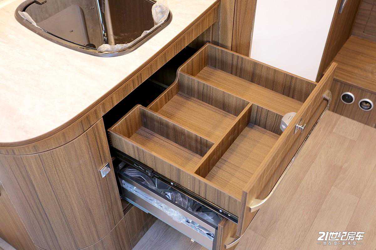 橱柜内是三层储物抽屉+弧形角柜的组合,二三层抽屉内部加装了内置分割层,便于固定餐具,最上层抽屉是分格的储物格,储物多样性。