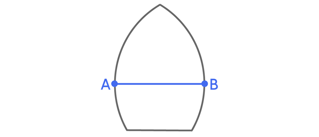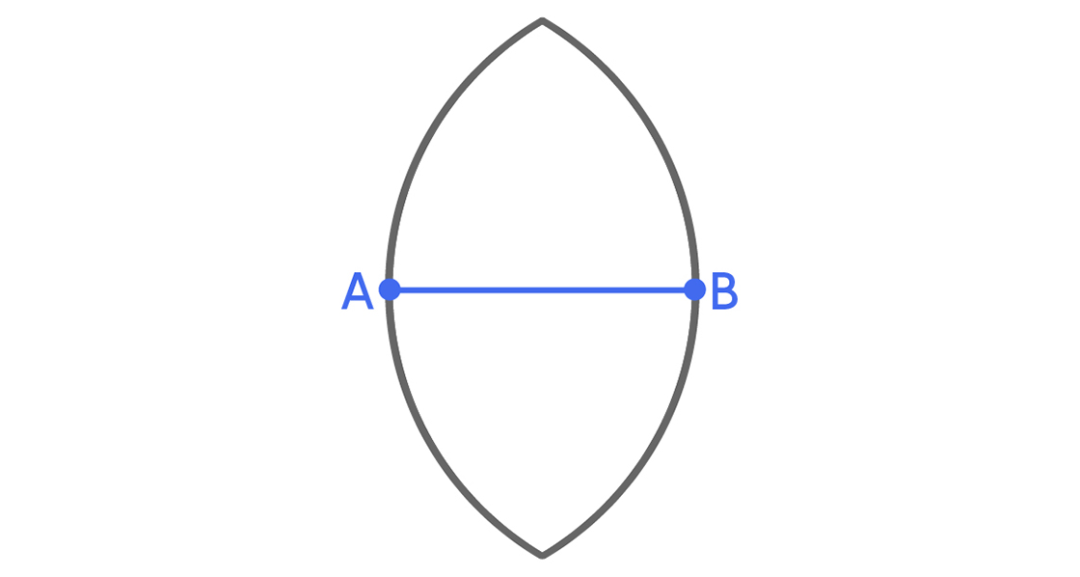 为了讨论这个问题,让我们先假想出任意一个宽度为1的形状R,虽然不知道它长什么样子,但其中一定存在相距1单位长度的两个点,我们称之为A点和B点。