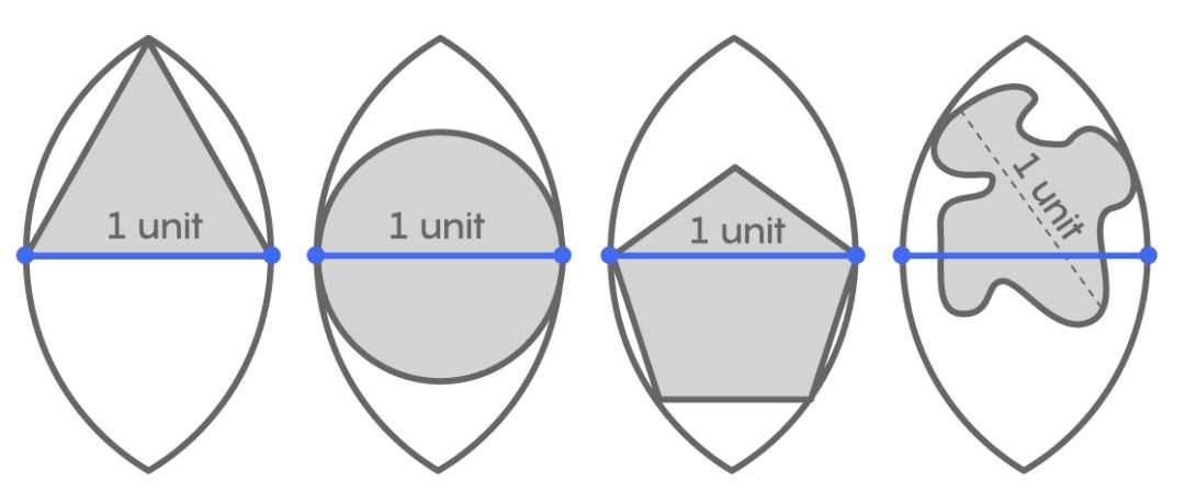 在数学中,这被称为“万有覆盖问题”(universalcoveringproblem)。这个问题是亨利·勒贝格(HenriLebesgue)在1914年写给另一位数学家朱利叶斯·帕尔(JuliusPál)的一封信中提出的。这个问题的说法有很多种,但它们的核心都是宽度为1,也就是在平面上有一个图形,图形中任意两点间的距离都不超过1。勒贝格的万有覆盖问题,就是要求找到一个面积最小的图形,使其能够“覆盖”所有宽度为1的图形。