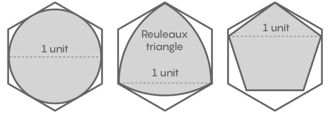 还记得勒贝格的那位数学家朋友帕尔吗?在收到勒贝格的来信后不久,帕尔就利用等宽曲线的性质证明,对边相距为1的正六边形就能做到万有覆盖(等宽曲线是指曲线上任何一对平行切线的距离都相等的曲线,圆就是最常见的一种等宽曲线)。