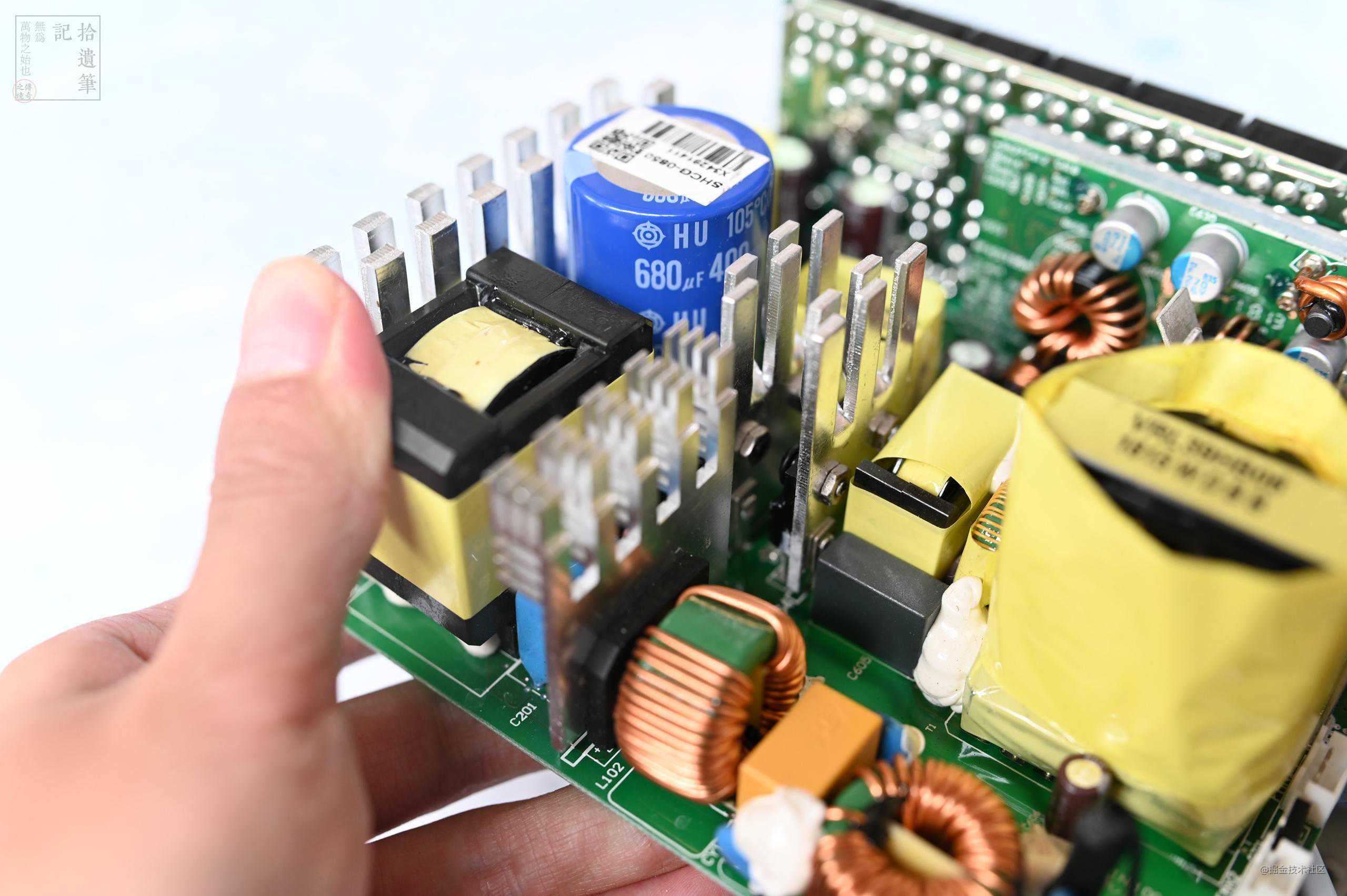 HCG850金牌电源采用全日系电容设计,不同批次的产品电容型号稍有不同,但规格基本相同,我的这件主电容为Hitachi日立HU系列,规格为680μF/400V/105℃,性能十分出色,其他批次可能会采用尼吉康、红宝石、日化等品牌同规格的产品。