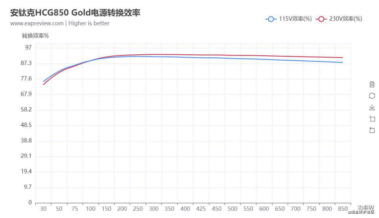 在电源转化效率方面,HCG850金牌在230V交流输入的环境下,输出50W时其效率已经超过了81%,后续输出效率最高超过93%,整体平均效率维持在91.5%左右,完全符合80PLUS金牌电源的标准。