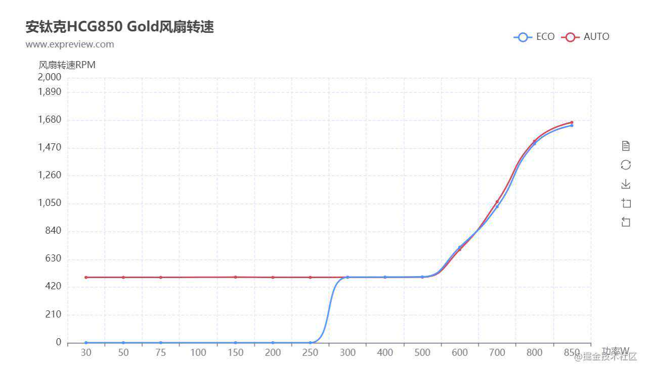 在风扇转速的控制上,HCG850金牌开启HybirdMode后,实验环境下,在300W的负载以内都是停转状态,噪音为0dB;关闭HybirdMode进入智能温控模式后,低负载只有500RPM的转速,噪音极低;在两种模式下,即使满载环境,风扇转速也只有1600RPM左右。