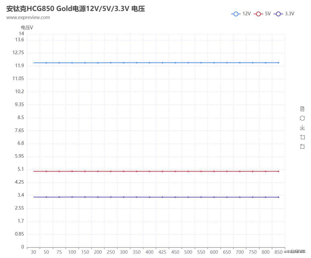 在电压稳定性方面,HCG850金牌的+12V/+5V/+3.3V电压波动都控制在1%以内,+12V与+5V的电压调整率甚至不到0.1%,充分确保了日常使用中的安全性。