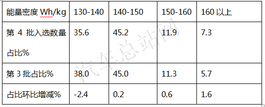 根据2020年第4批目录统计,上榜纯电动车型搭载的电池能量密度区间及占比: