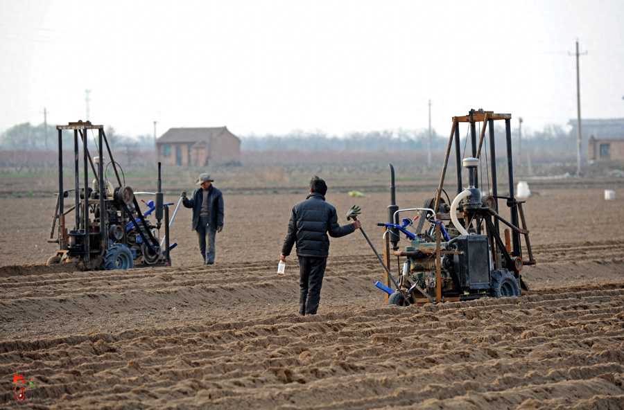 据来自山东菏泽的种植户介绍,自然种植山药一般选择土质疏松的沙土地,这样便于山药根茎的生长,但随着人们对产量和品质的不断追求,山药不但要粗、还要长就成为种植户的目标。经过山药产区科技人员的不断努力,人们想出了把山药成长的土壤弄松软的办法,还开发出了一种山药开沟机,满足了种植户的需求。图为两名男子分别开着山药开沟机在农田里忙碌。