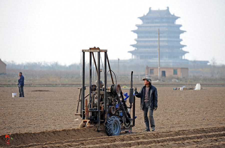 这名负责开沟的师傅是黄河对岸陕西大荔县人,姓刘,今年52岁,因为具备开沟的技术,每年春季都来永济为种植户打工开沟。工作一天,种植户支付他150元的劳务费用。图为开完一垄后,刘师傅在地头移动开沟机。