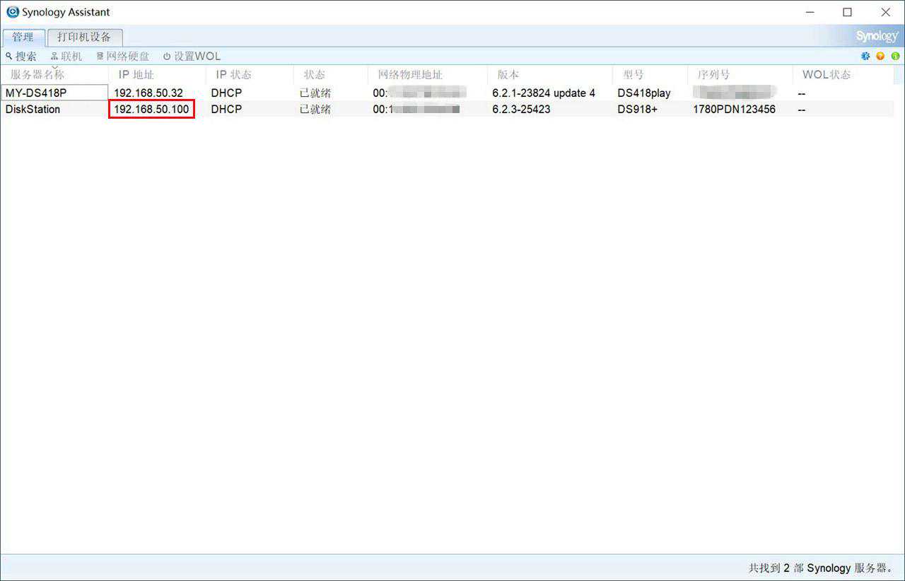 由于本人已经有一台白群晖(DS418play)了,所以群晖助手里显示了两台NAS,靠下方的这台就是新增的黑群晖了,记住这台NAS的IP地址(192.168.50.100)。