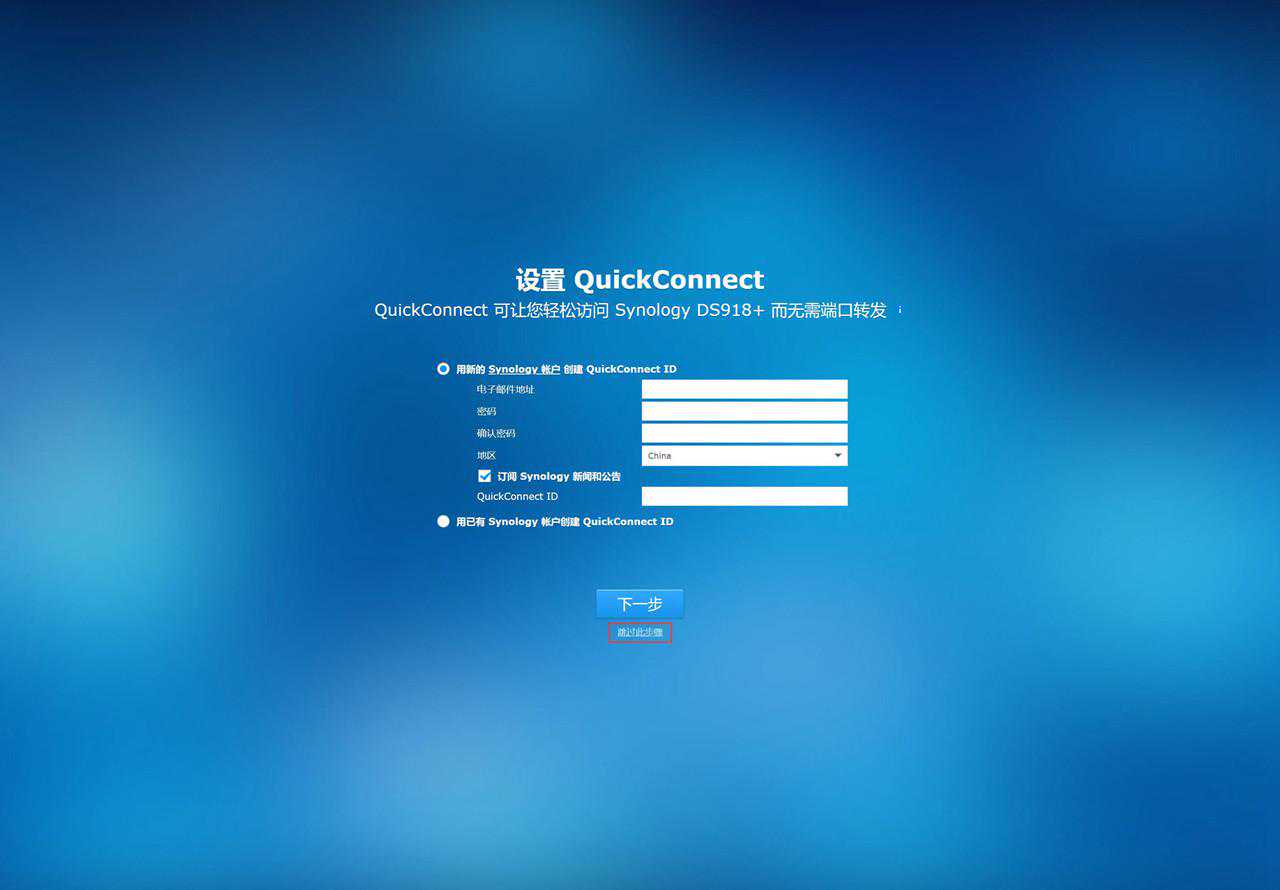 QuickConnect是白群的专属功能,这玩意黑群不好破解,所以就只能点跳过此步骤了。
