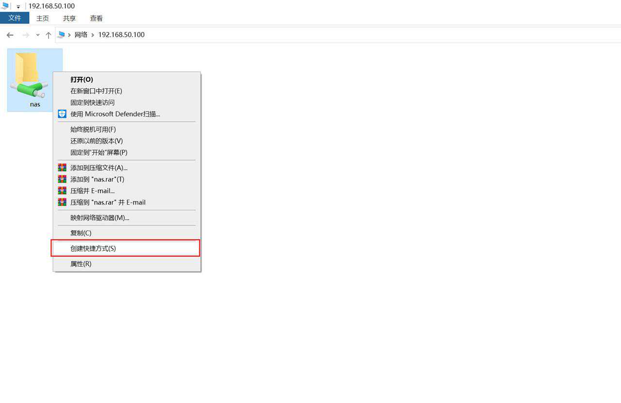 接着打开我的电脑或网络,在地址栏输入两个反斜杠192.168.50.100(NAS的IP地址),弹出一个对话框,输入NAS的账号密码,然后进入NAS中,右键共享文件夹,创建快捷方式到桌面,这样以后你就可以直接在桌面打开这个共享文件夹了。