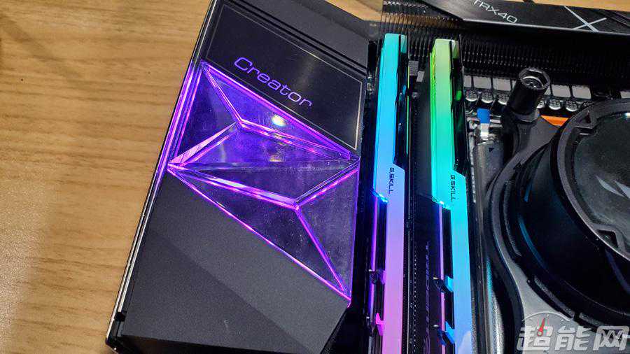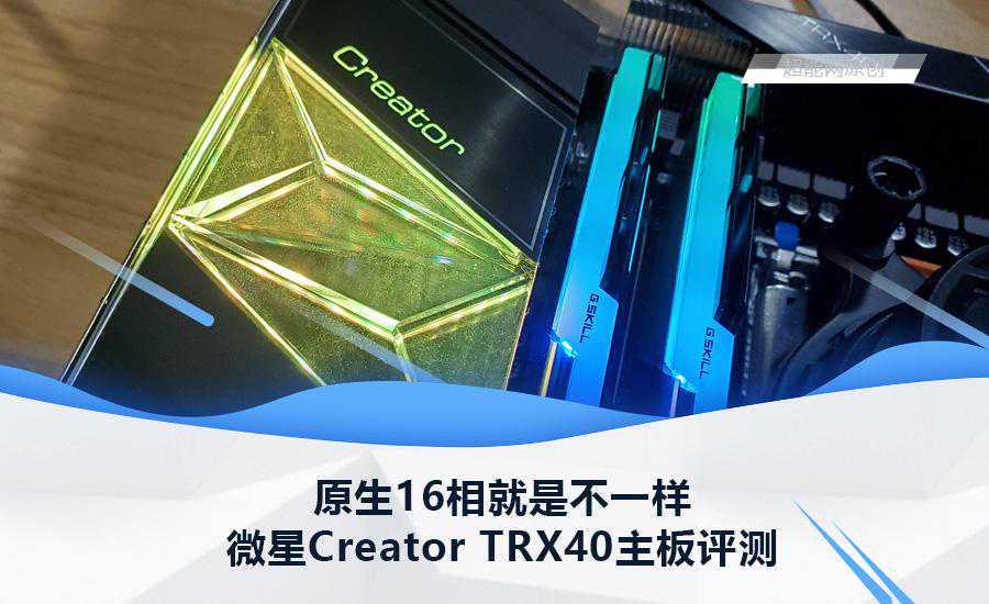外观方面微星CreatorTRX40的设计风格和此前测试的CreatorX299类似,微星这一代Creator主板都是这风格,不过由于TRX40的南桥要加风扇,所以只在I/O装甲上有加装水晶状的透镜灯光,其实上面的CreatorLogo也是会发光的。