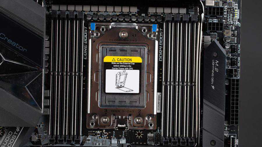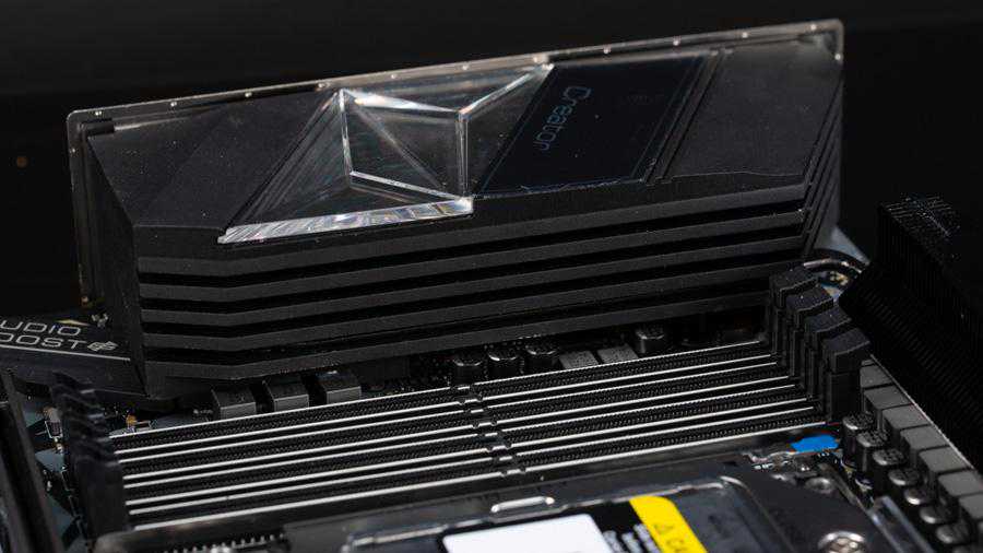 巨大的SocketsTRX4插槽占据了主板很大一部分空间,两侧各有四条DDR4内存插槽,全部都是单边卡扣设计并且有金属装甲包裹,Zen2架构处理器对内存支持频率大幅提升,CreatorTRX40主板可以支持DDR4-4666的内存,最大内存容量256GB。