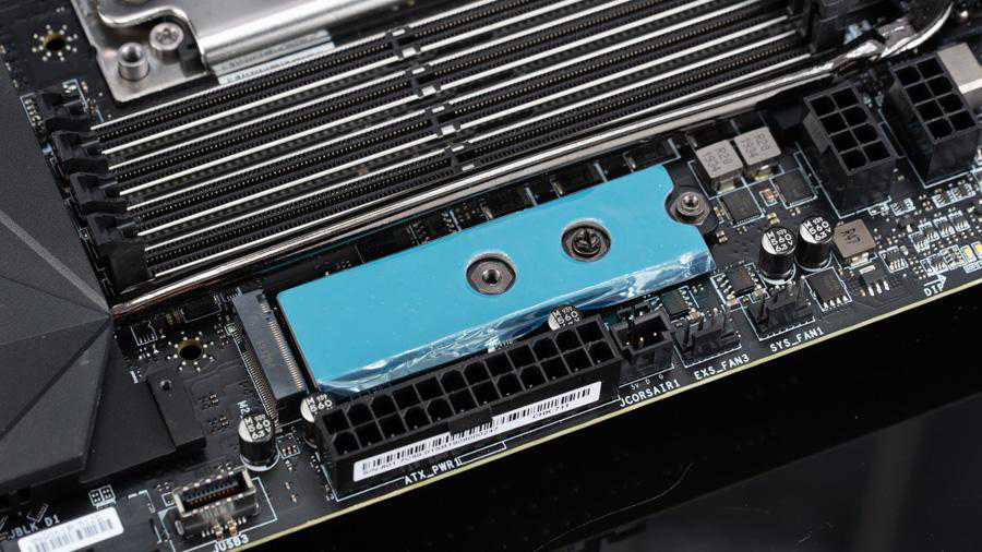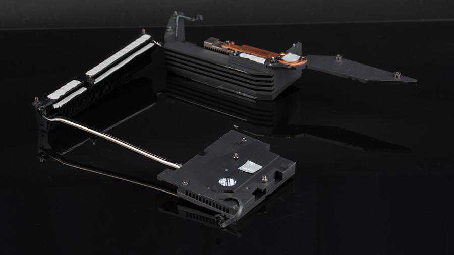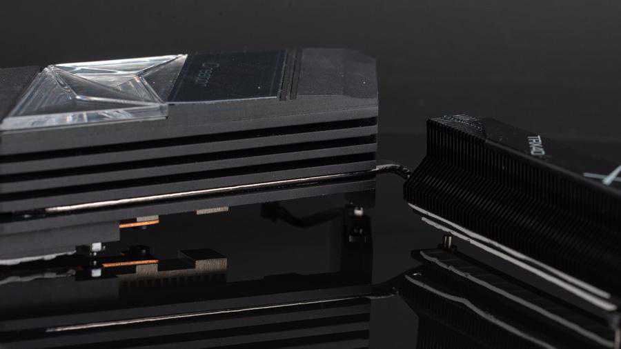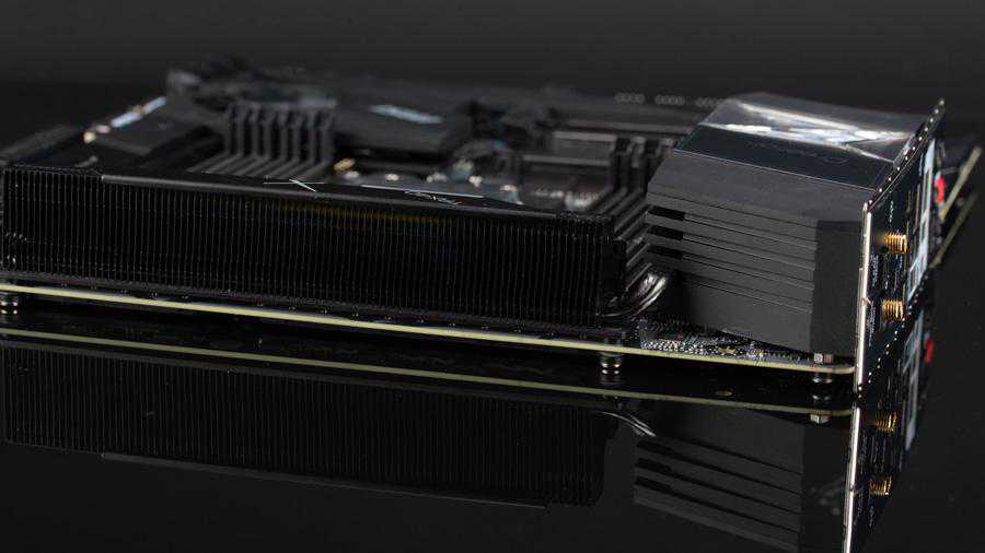 此外这主板上的散热器也是一大特色,考虑到SSD正反面的散热,不单只设计了正面的散热器,背面的散热器也有所准备,这种设计此前是没人考虑到的,其实大容量的多数是双面设计的,SSD反面的闪存也需要散热的。