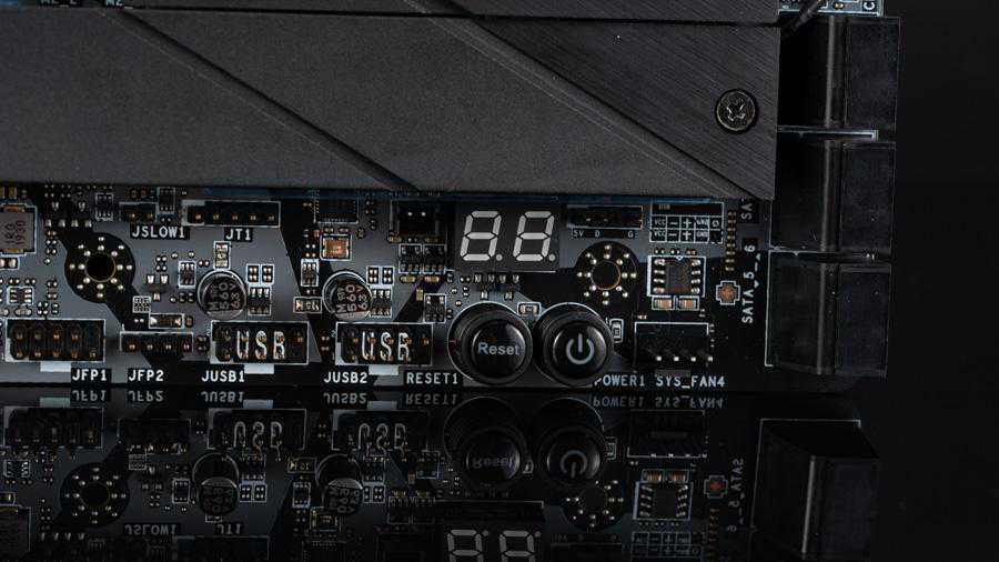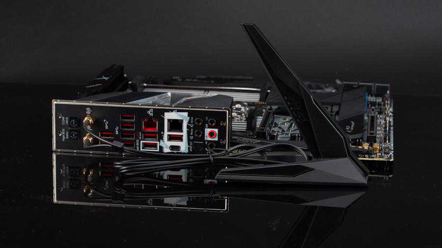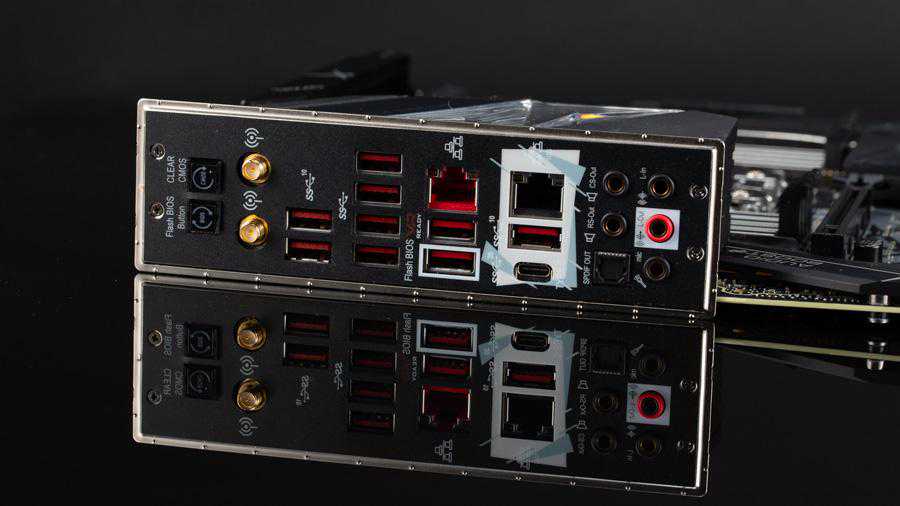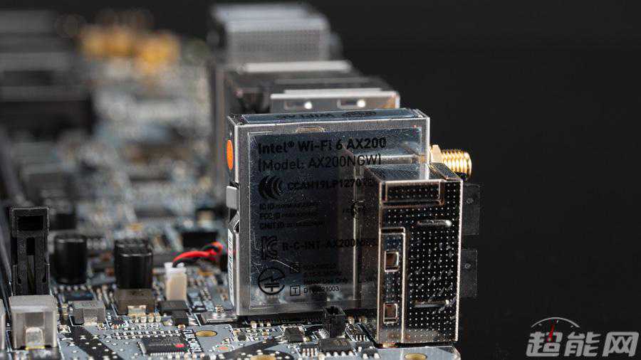 背板接口包括四个接口,五个接口,一个接口,一个IntelI211V千兆网卡,一个AquantiaAQC107万兆网卡,IntelAX200无线网卡,支持WiFi6和蓝牙5.0,音频接口包括一个光纤S/PDIF输出和5个镀金的3.5mm口,两个按键分别是清空CMOS和FlashBIOSButton,它配合旁边白色框的接口可以在不安装CPU、内存、显卡的情况下刷入新BIOS。