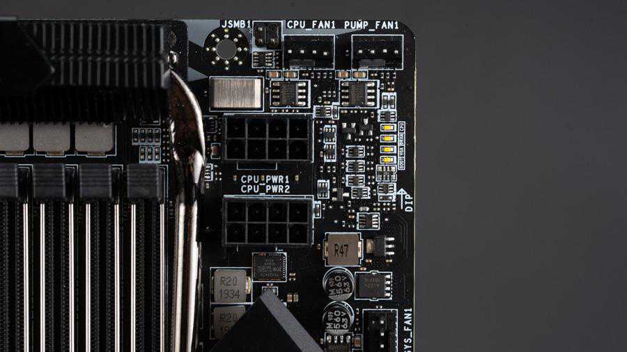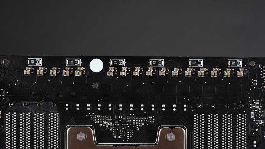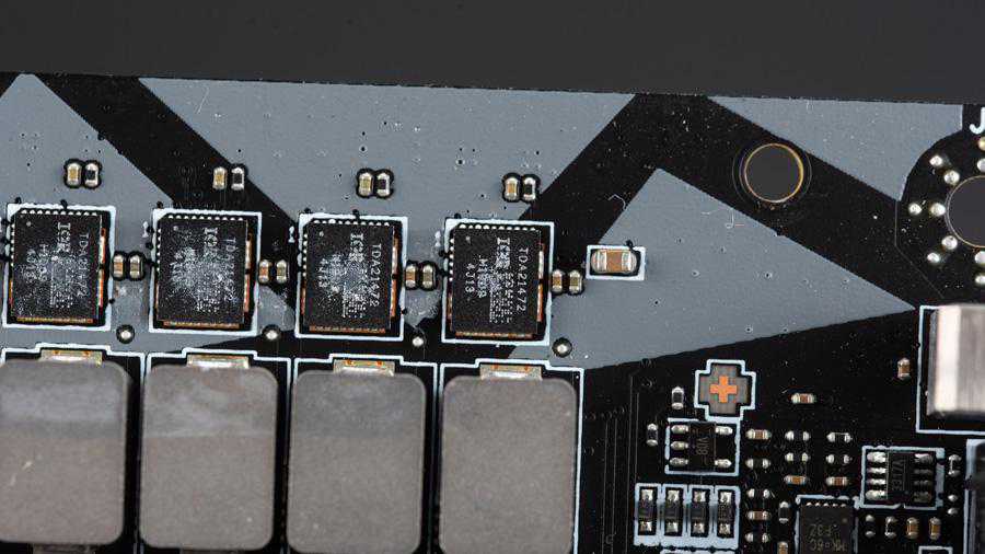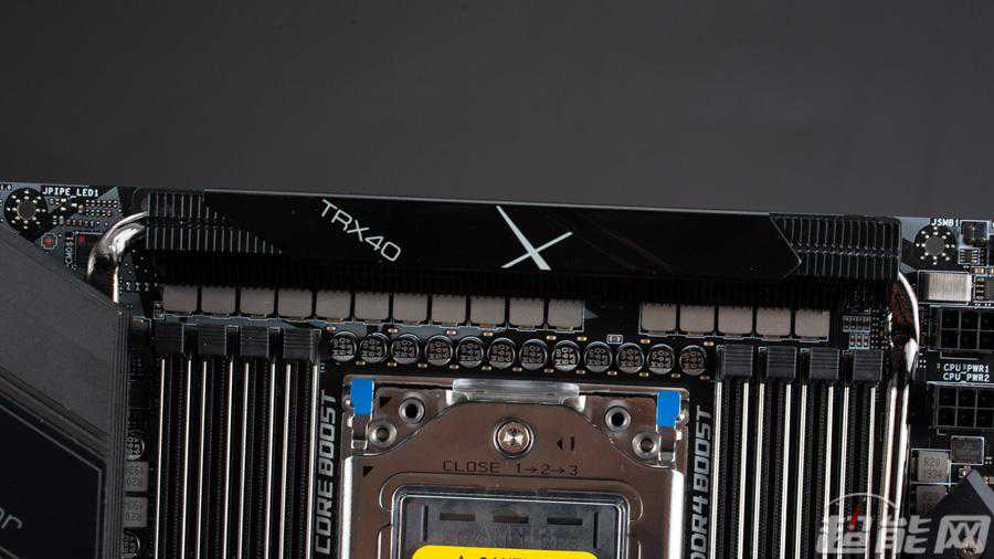 主板使用了英飞凌最新的原生16相供电PWM控制器XDPE132G5C,现在不用倍相器就能驱动全部16相CPU供电了,每相供电都配备一个英飞凌TDA21472,单颗最大输出电流是70A,它是一个整合式的DrMOS,英飞凌给它的商品名称为DrBlade。CPU供电的一级滤波电容和8颗倍相器都藏在主板的背面,一级滤波电容全部都是扁平的聚合物电容和MLCC陶瓷电容,而二级滤波电容则在SocketTR4接口上方,全部都是日化的固态电容。