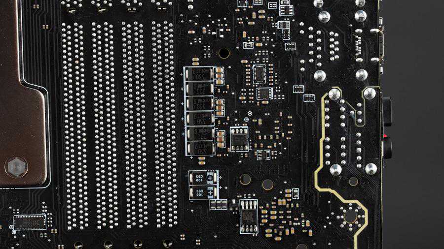CPUSOC供电位于I/O接口旁边,有I/O装甲帮他散热,所用MOS同样是英飞凌TDA21472,滤波电容也是被设置在主板背面的聚合物电容。