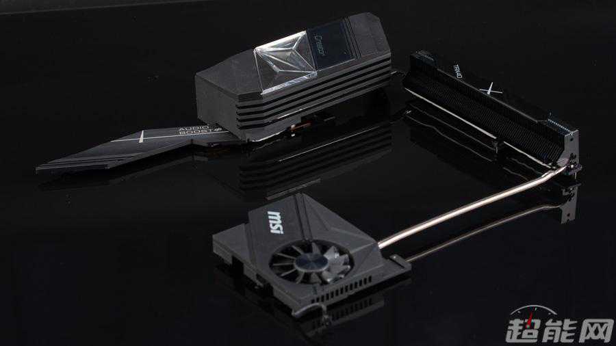 配件里有扩展卡,它的样子和微星的AERO显卡的样子非常相似,是一块的扩展卡,可以把接口拆分成四个PCI-Ex4,接入4只,甚至可以自由组RAID,同时为保证4只不会过热掉速,采用MSI独家TORXfan风扇技术专利扇叶设计,和AERO系列ITX显卡上面用那个设计是差不多的,所以两者外形看起来差不多一模一样。