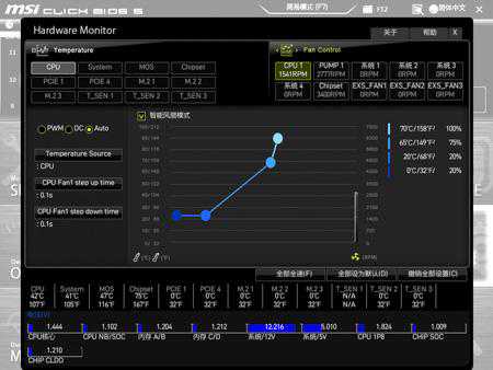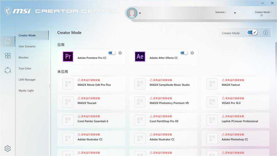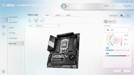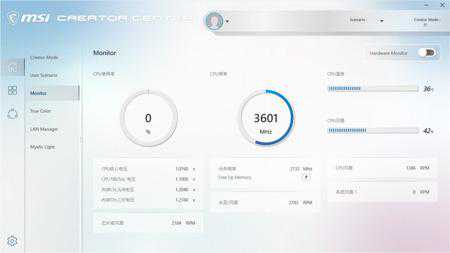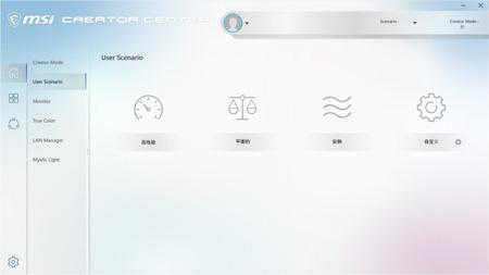 主板定位明确,面向创作者,所以微星CreatorTRX40可以使用CreatorCenter,它其实整合了微星的多款软件,比如微星的CPU超频工具、系统监测器、网络优化、MysticLight等等,它可以快速调整整机的系统环境设置,有预设的高性能、均衡、静音及省电等四种模式。