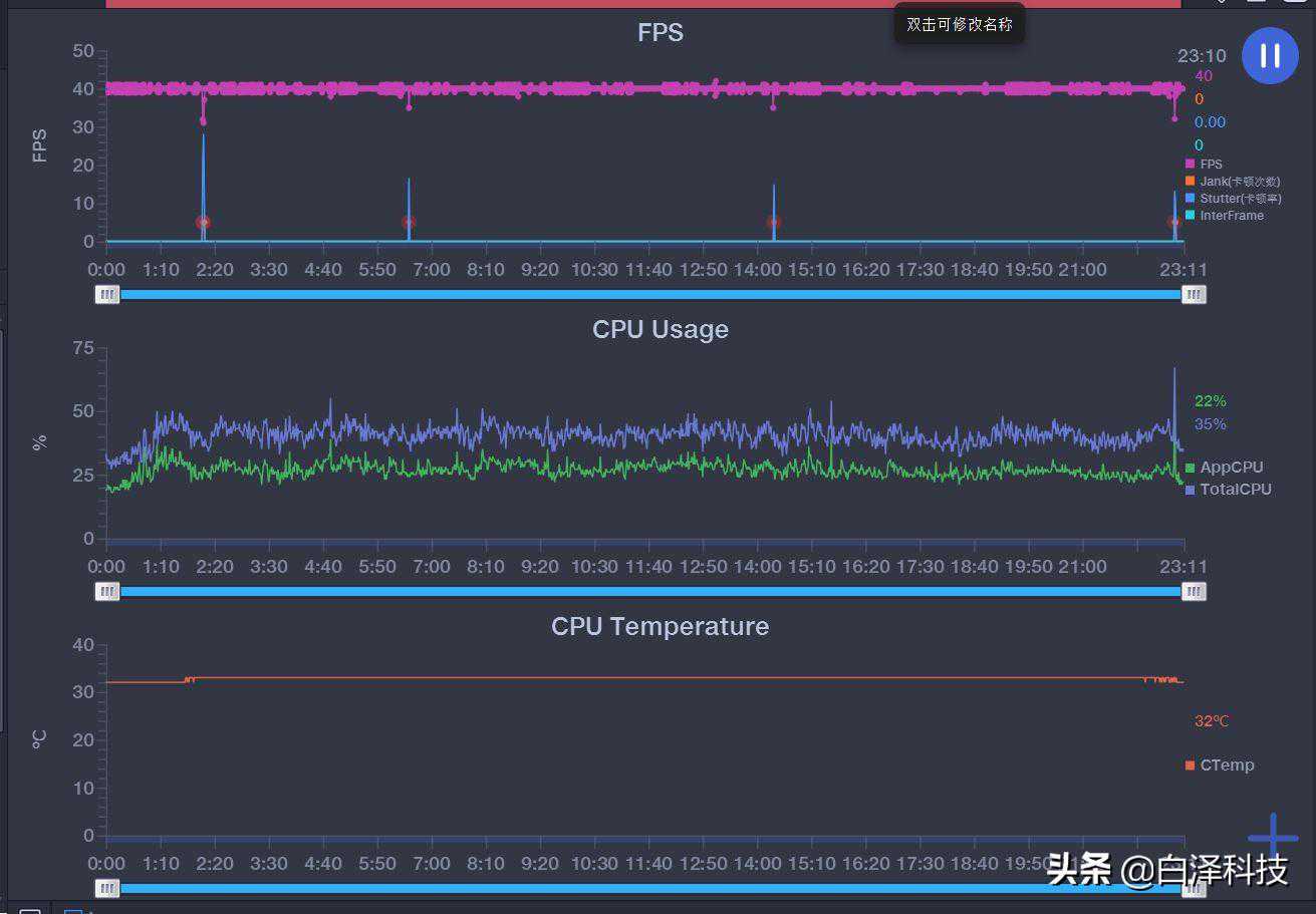第二次选择的是HDR高清画质+超高帧率+经典风格模式,还是四人排位赛,游戏时长23分钟,平均帧率39.9FPS,每分钟10min帧数跳动3次,平均温度32.9℃。