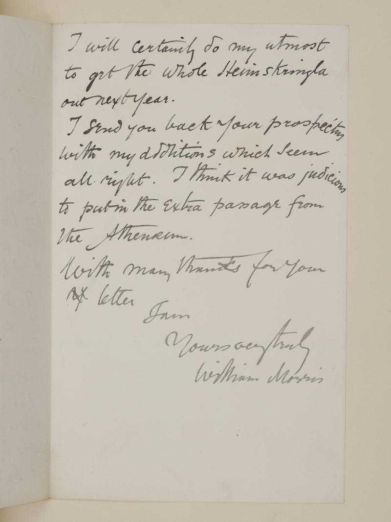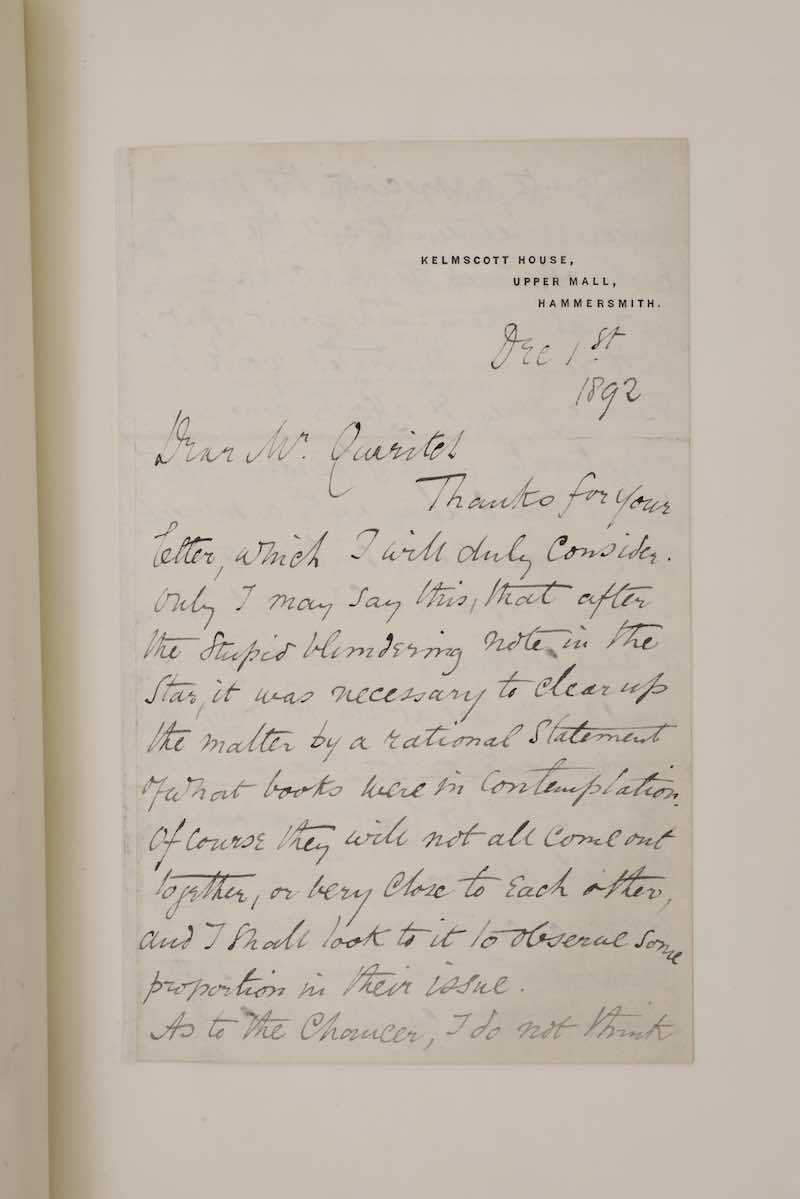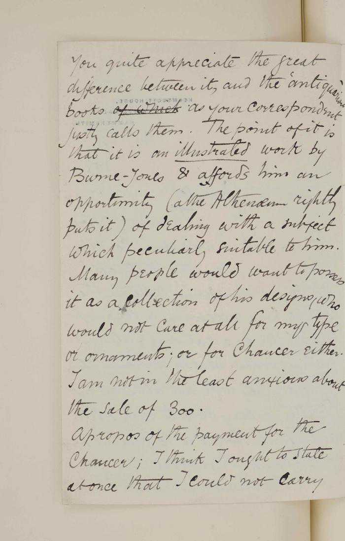 关于《乔叟作品集》的报酬,我想现在就说清楚,除非我得到应有的报酬,否则我无法继续工作,我真的无法继续,希望您能理解【注4】。当然我不会认为您之前说过的关于此书的所有话都是铁板钉钉,在我们签署正式协议之前,您有权重新考虑。
