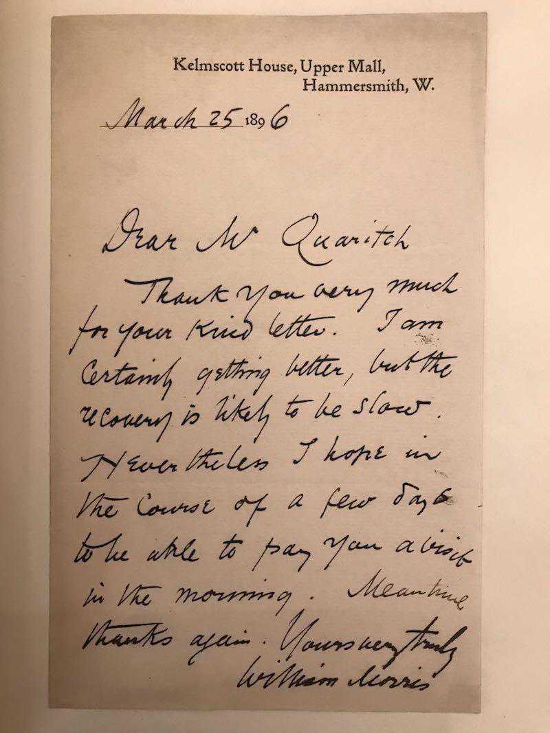 因此,如果我们通过莫里斯的信件来讲述他和夸瑞奇之间的关系,就能纠正科克瑞尔和麦凯尔的版本。依照他们的叙述,在凯尔姆斯科特出版的历史上,夸瑞奇几乎就不存在,夸瑞奇如何帮助莫里斯建立他的图书馆,更是根本就没被提起【注1】。从这些信件中,我们能看到莫里斯在出版业新手上路还要依靠夸瑞奇的指点,也曾经希望他能够出版那本伟大的《乔叟作品集》,后来莫里斯终止了这个协议(在法律上他是否有这一权利尚且存疑),最后将过去的恩怨抛到了身后。毫无疑问,莫里斯的名气和他的社会地位,也让夸瑞奇对他刮目相看,让后者接受了莫里斯对他们之间的关系有着决定权,虽然他也不乏抱怨(如他给儿子的信中所暗示的那样)。莫里斯在去世之前对夸瑞奇究竟有什么看法,大家也都很感兴趣。从1895年的通信中,我们能看出他们的关系还是很友好的,而且他也再次从夸瑞奇的书店里买书。在1896年3月25日的信中,他提到夸瑞奇询问他的健康状况,并表示感谢,说明他们重新又有往来,当然,这种往来可能仅与购书有关。人们可能也想知道,当麦凯尔的《莫里斯传》在1899年出版时,夸瑞奇肯定会注意到书里完全把他抹去了,他的想法又是什么?夸瑞奇是否猜测到这位他并不相识的麦凯尔所依靠的,都是科克瑞尔提供的信息。